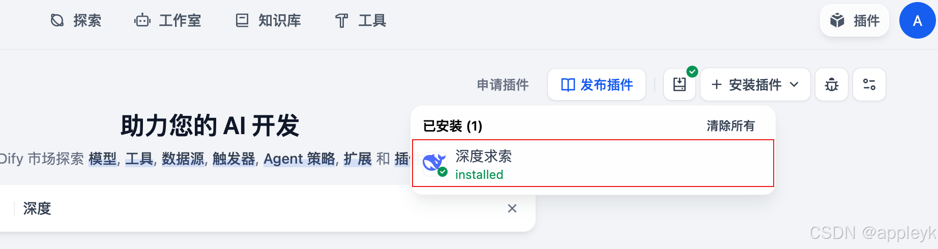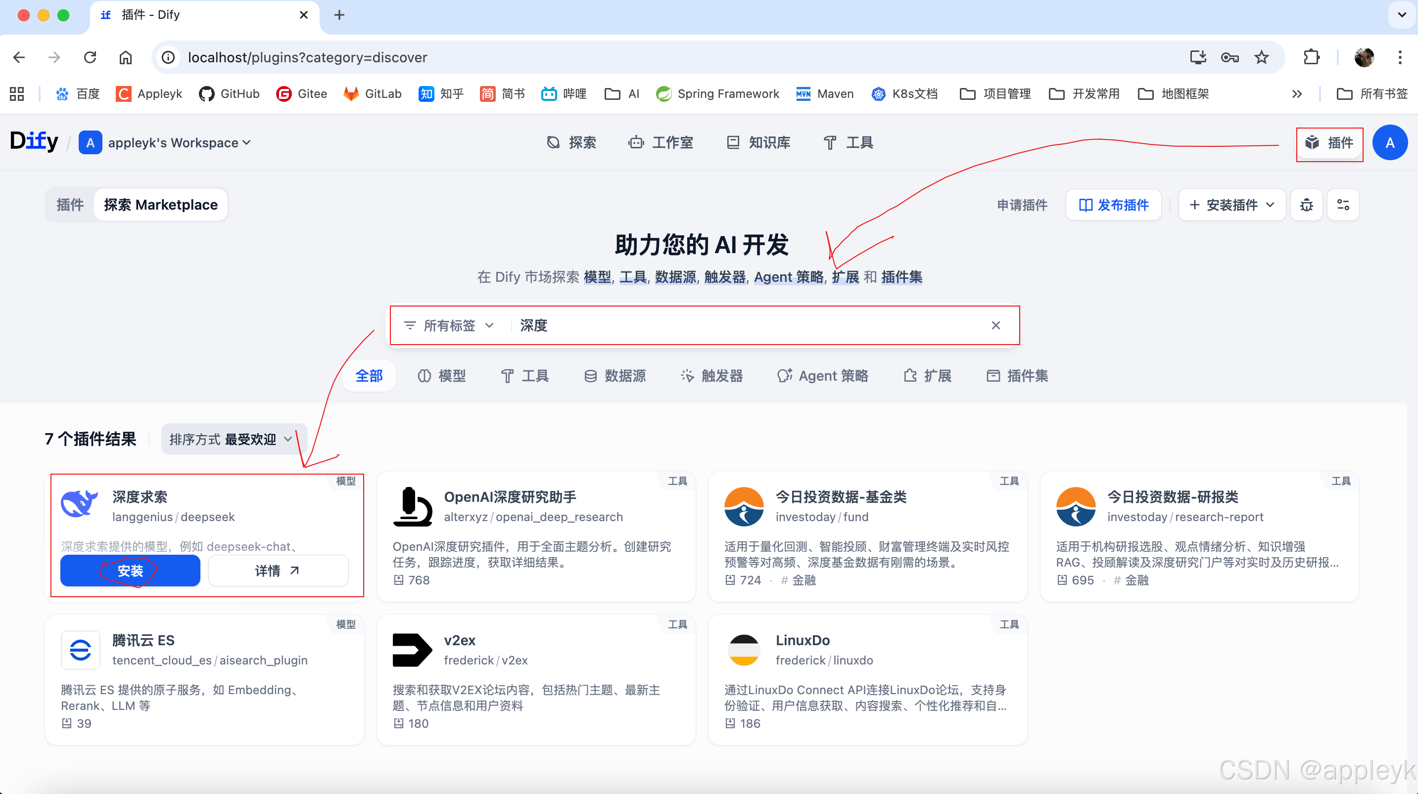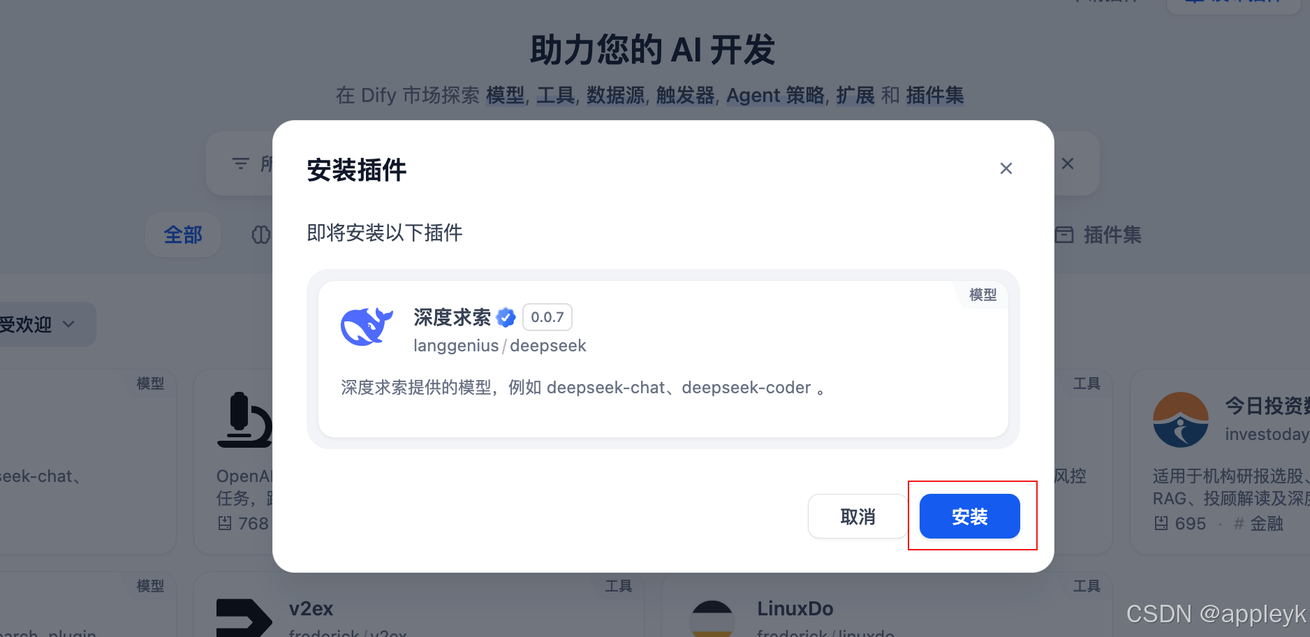 这里以深度求索DeepSeek为例子,来安装下插件(插件的概念不是把模型下载到本地进行跑,而是安装对应llm的python库及工具,后续运行的话,还需要配置apikey)