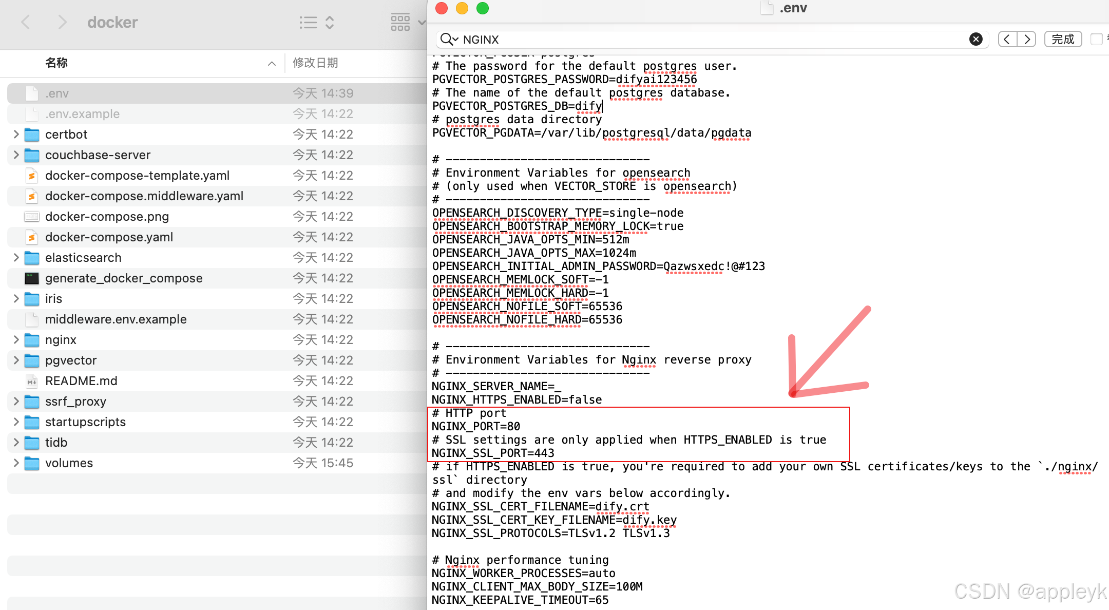 在章节2中我们复制了.env文件,其中我们可以修改nginx容器的端口,如下: