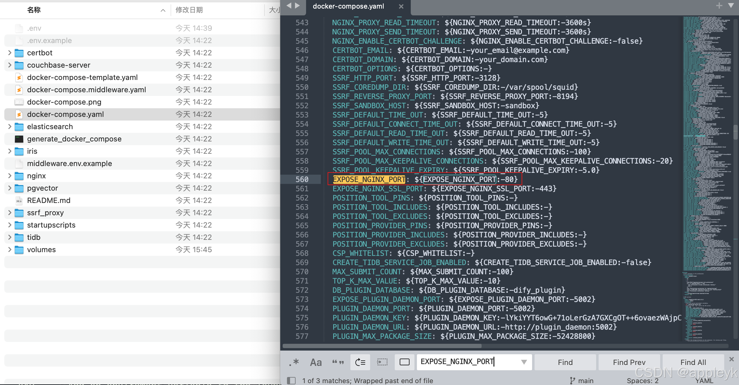 另外在.env同级目录下有一个docker-compose.yaml文件,我们可以修改nginx容器暴露在宿主机上的端口号,如下: