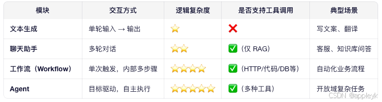 文本生成 (Text Generation):专注于一次性生成高质量的内容,例如广告文案、邮件撰写或摘要提取。用户通过填写变量触发 AI 输出结果,核心在于设计高质量的提示词 (Prompt)。它适合需要快速生成结构化或非结构化文本的场景。