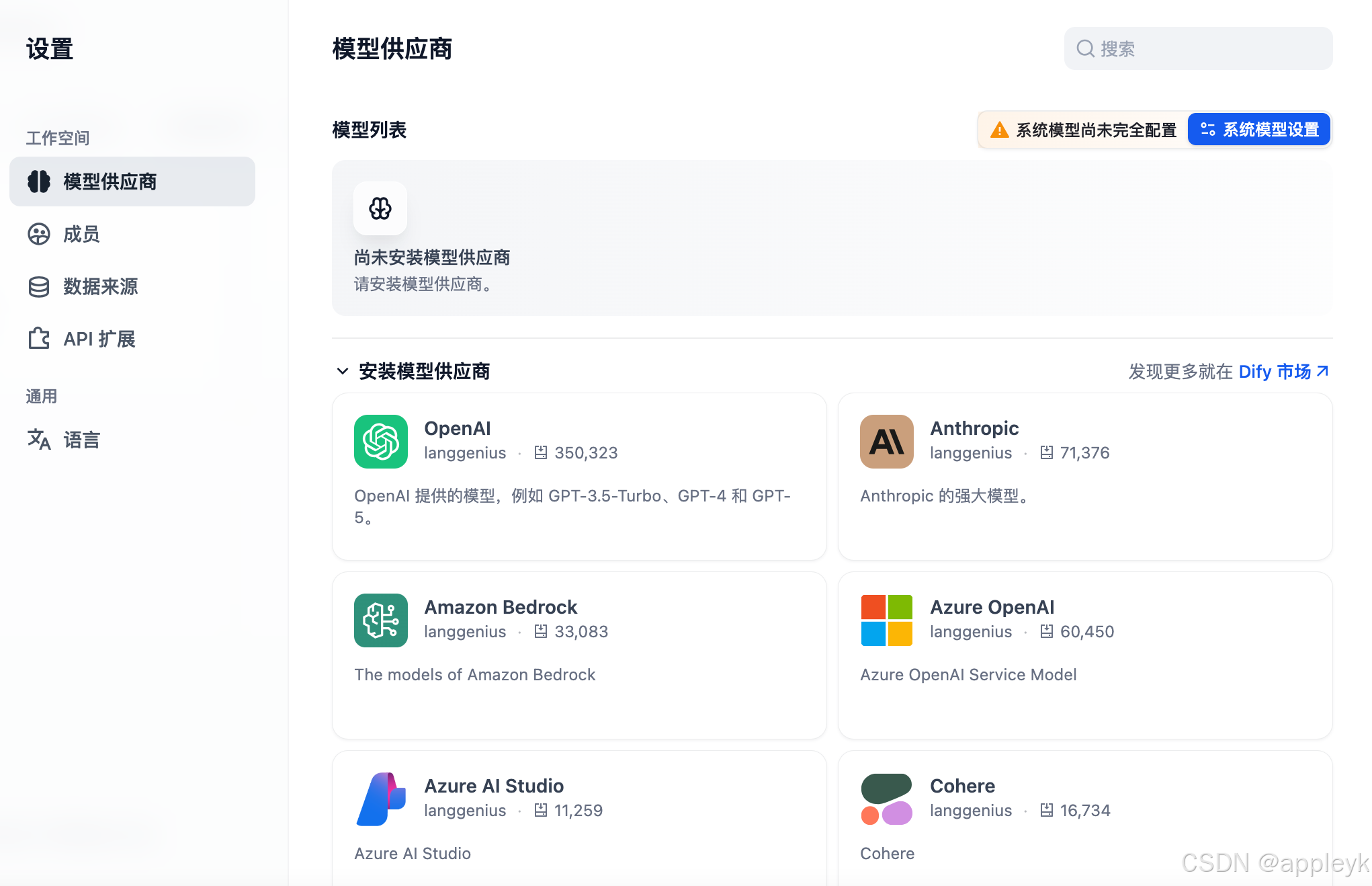 大语言模型是基石,而大语言模型非一家独大,有条件的都会自己搞,所以选择一个靠谱的LLM供应商是非常重要的。dify的插件市场简直🐂,太棒了,这里有条件的你可以用OpenAI,国内的用千问、百炼、火山或者深度求索,当然本地部署个人的话就用Ollma、追求高性能的就用Vllm等。