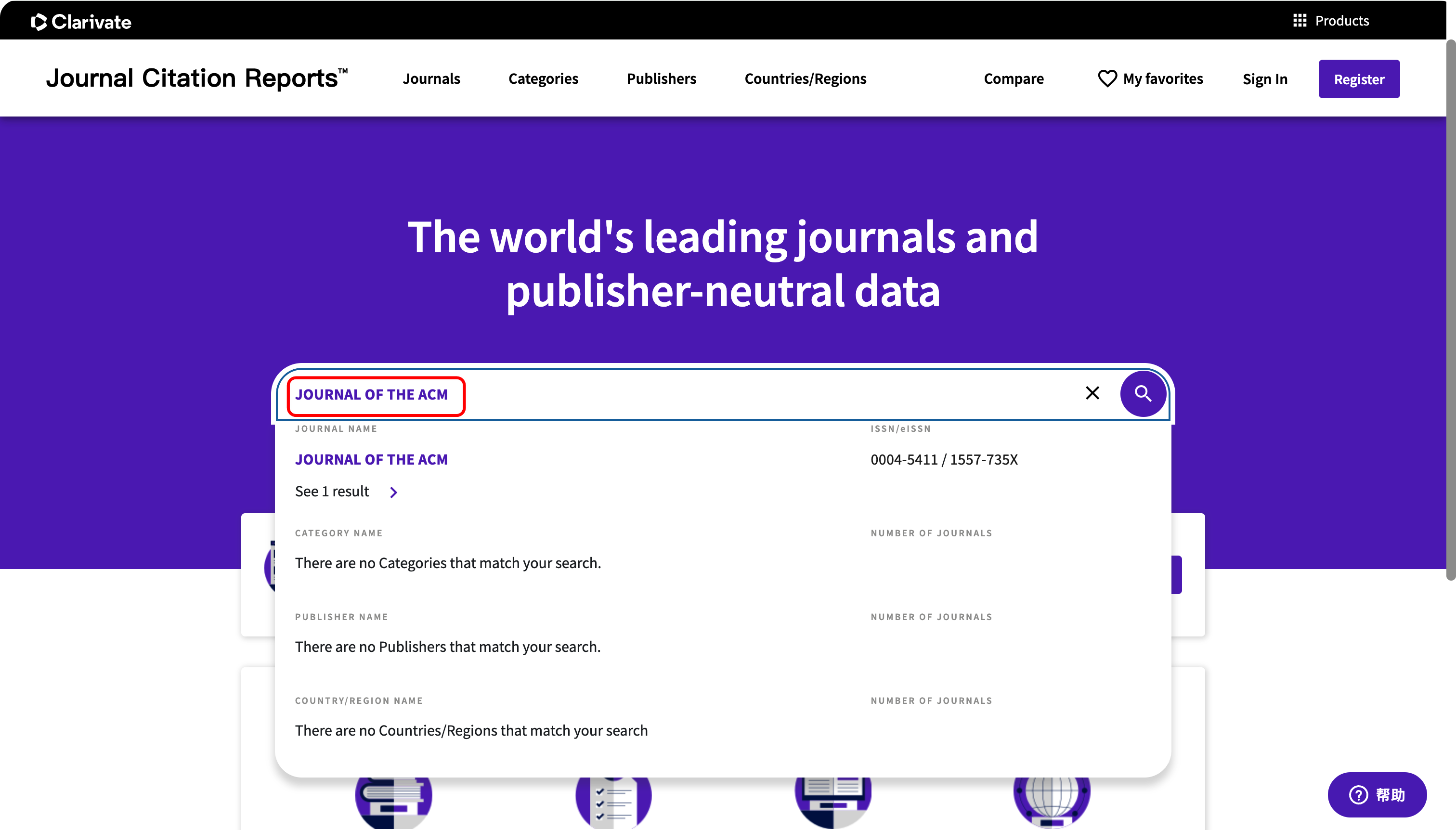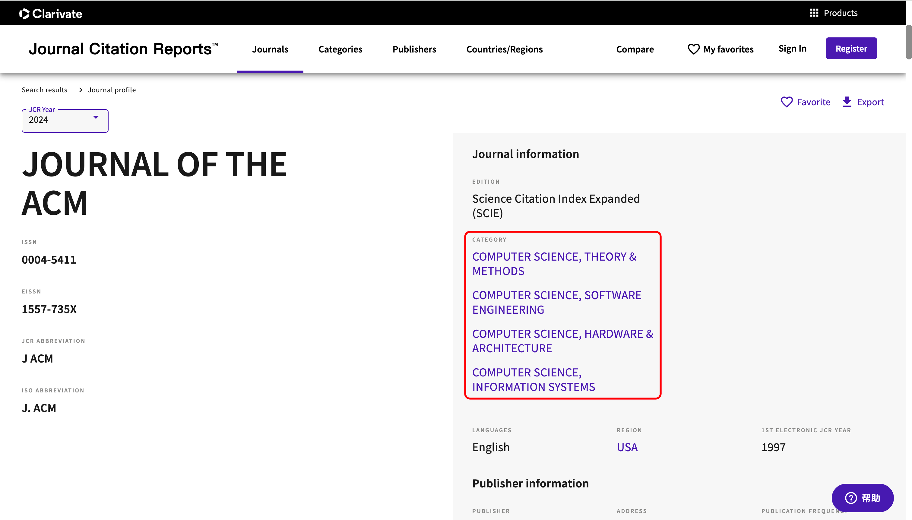 可以看到期刊"JOURNAL OF THE ACM"在InCites Journal Citation Reports(JCR)中对应的分区为Q3,对应学科类别包括:"COMPUTER SCIENCE, THEORY & METHODS"、"COMPUTER SCIENCE, SOFTWARE ENGINEERING"、"COMPUTER SCIENCE, HARDWARE & ARCHITECTURE"、"COMPUTER SCIENCE, INFORMATION SYSTEMS"。