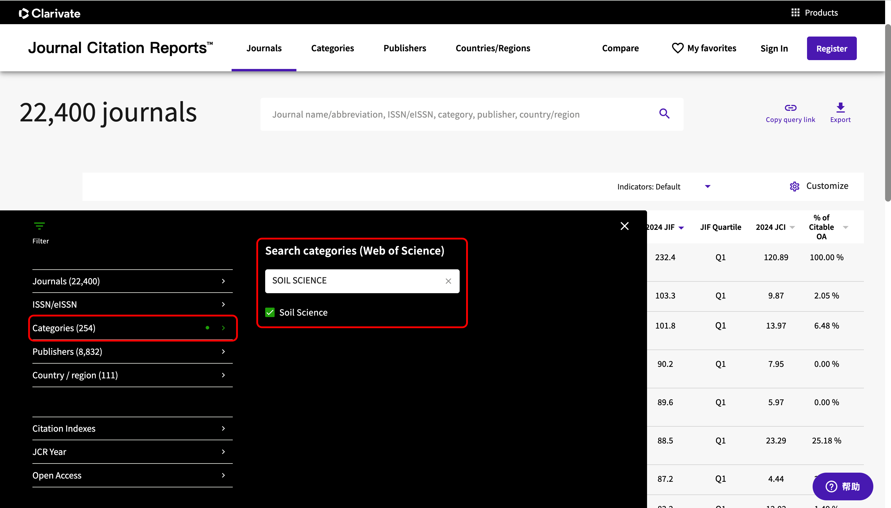 在JCR网站,设置"Categories"为"SOIL SCIENCE"。