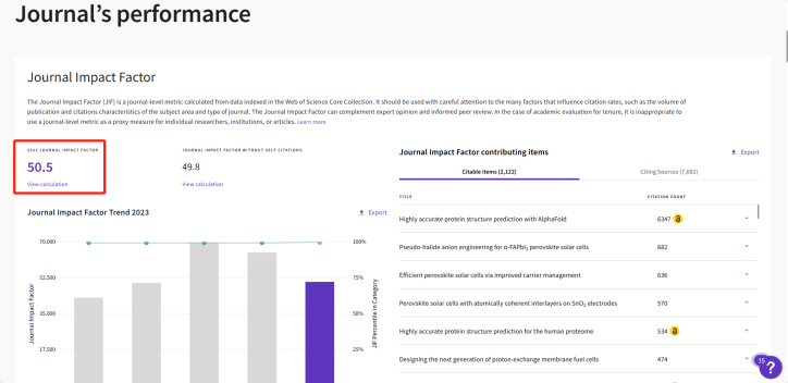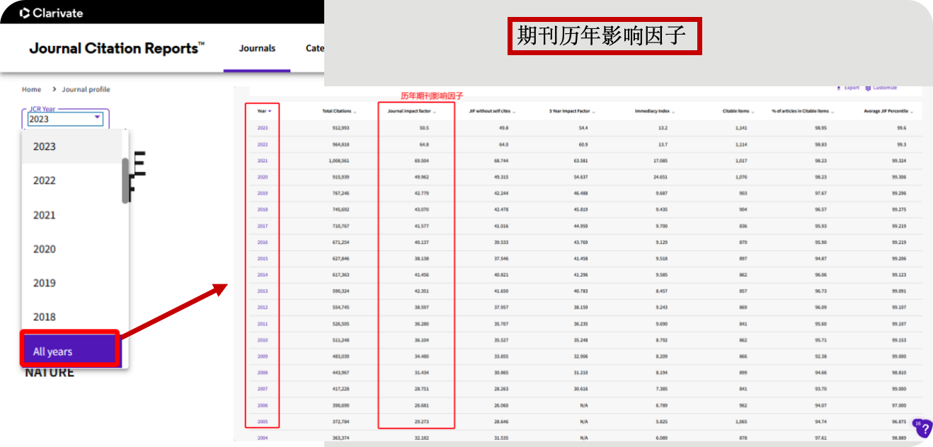 示例3:Nature期刊JCR、Q分区和期刊历年影响因子。