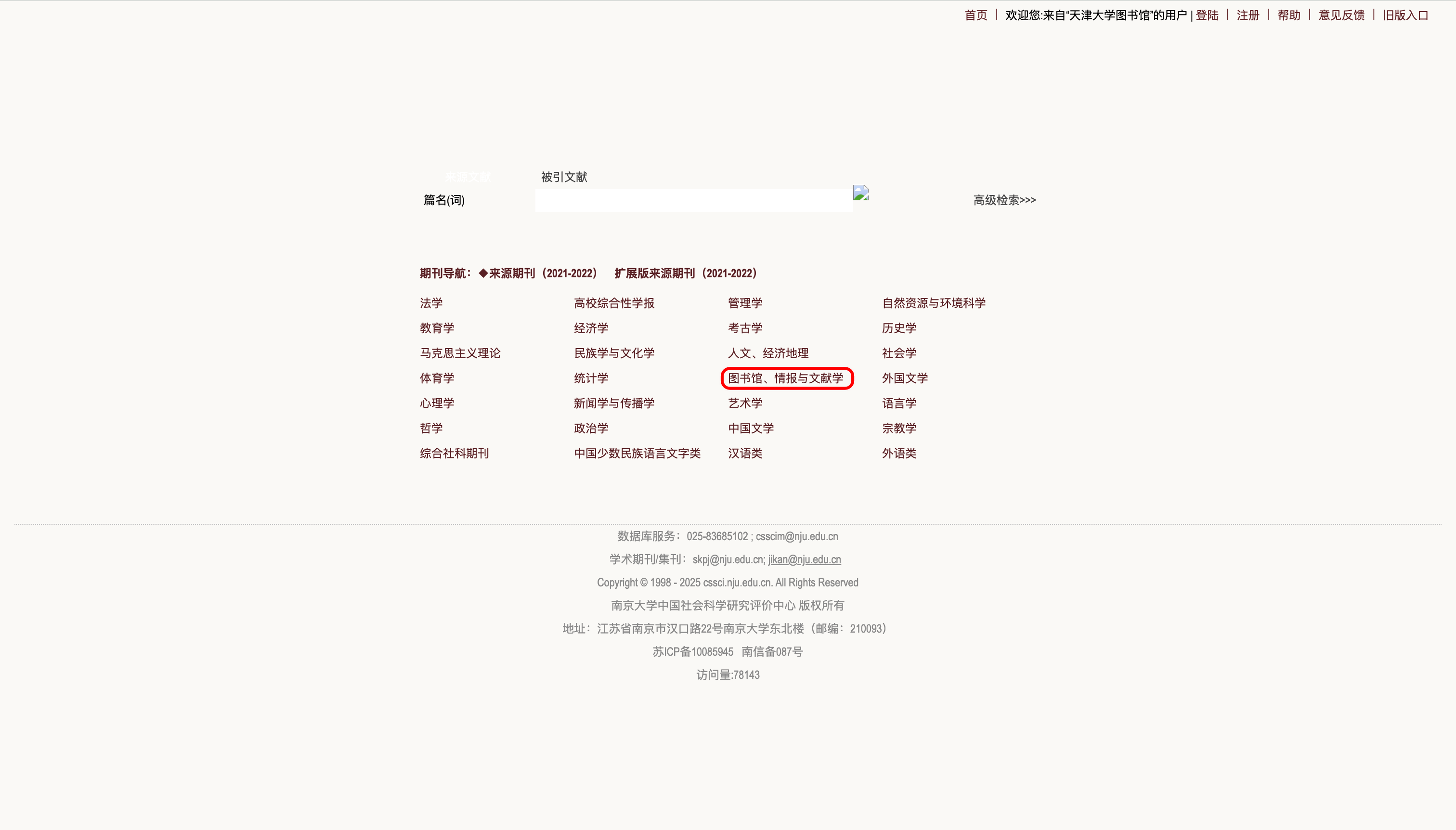 进入CSSCI后,点击"图书馆、情报与文献学"。