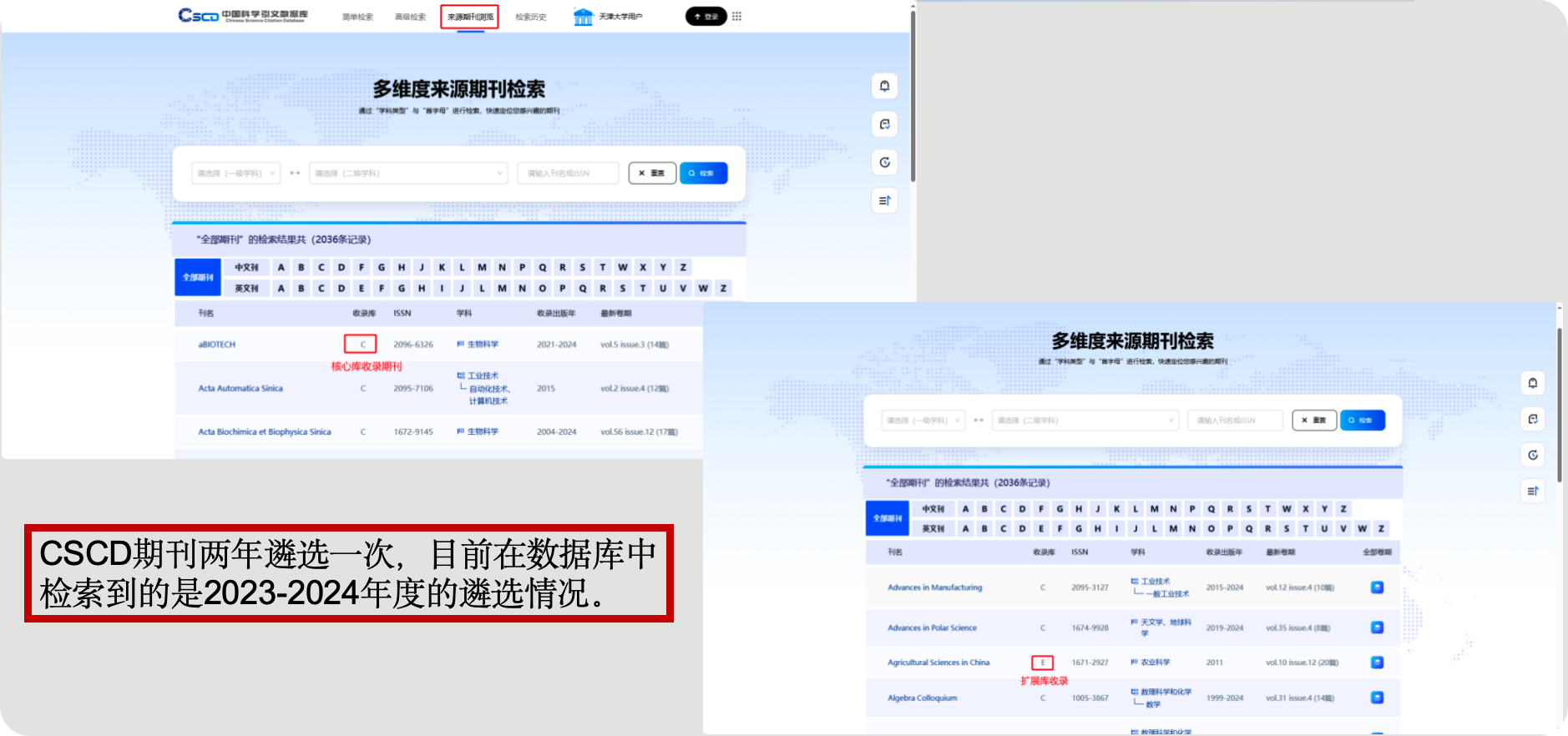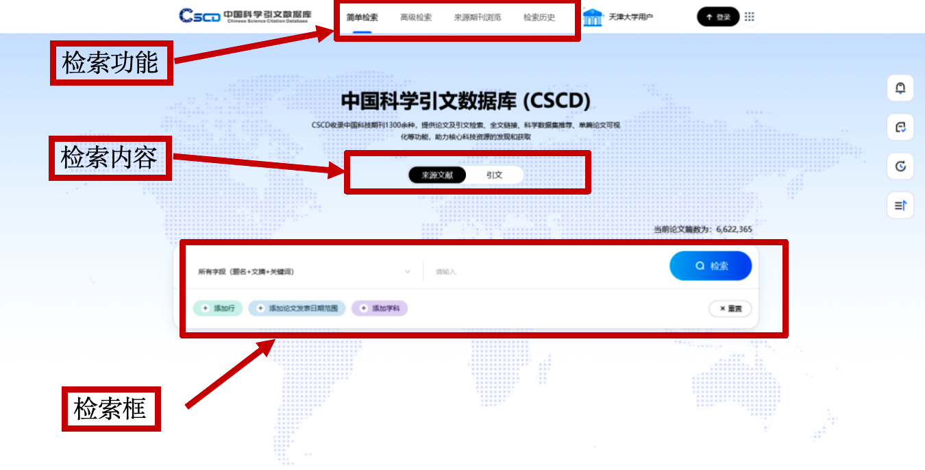 同样通过天津大学图书馆电子资源平台,登录后搜索CSCD并跳转到CSCD检索网站。