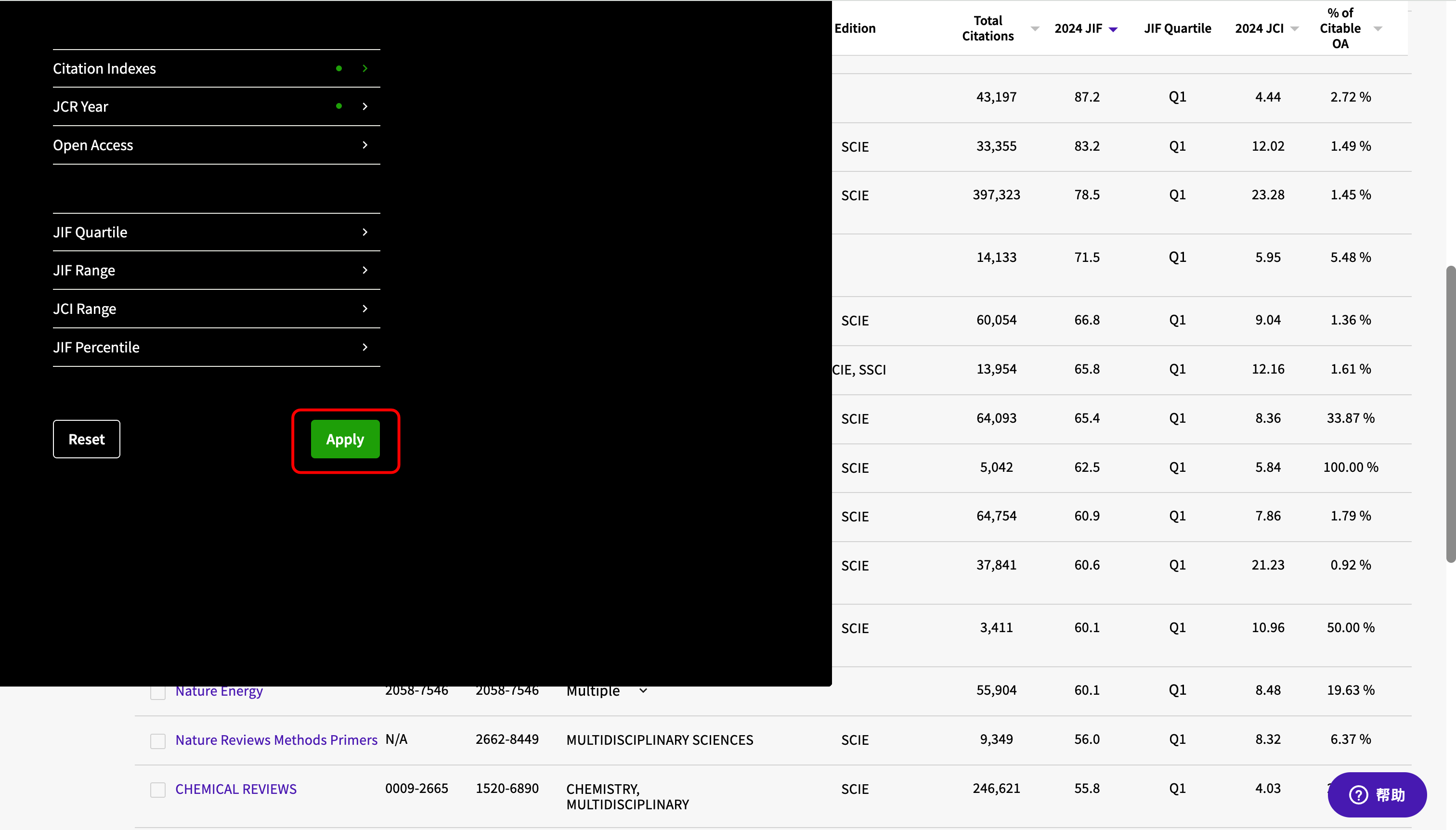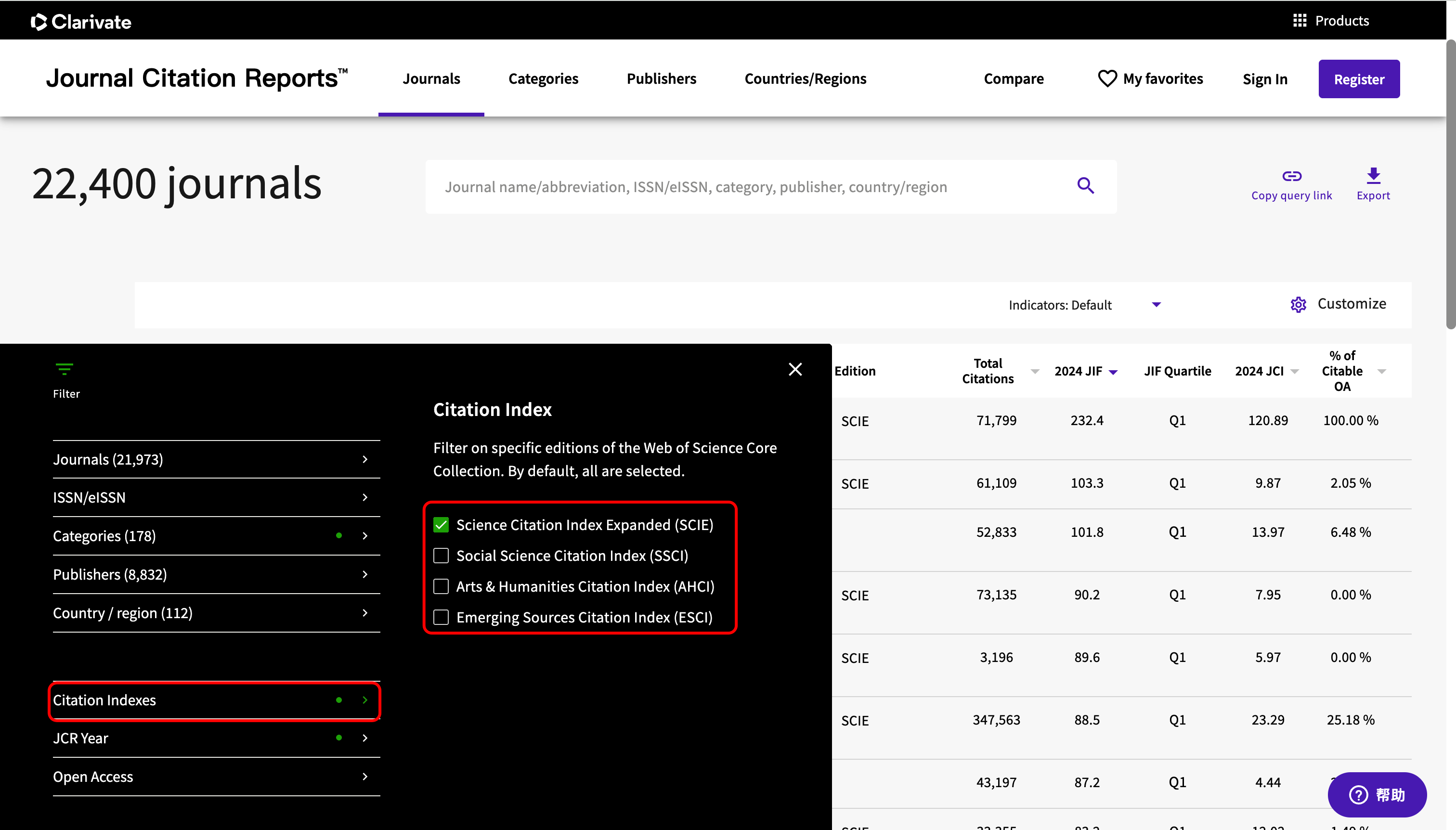 在JCR网站,设置"Citation Indexes"并只勾选"SCIE"。