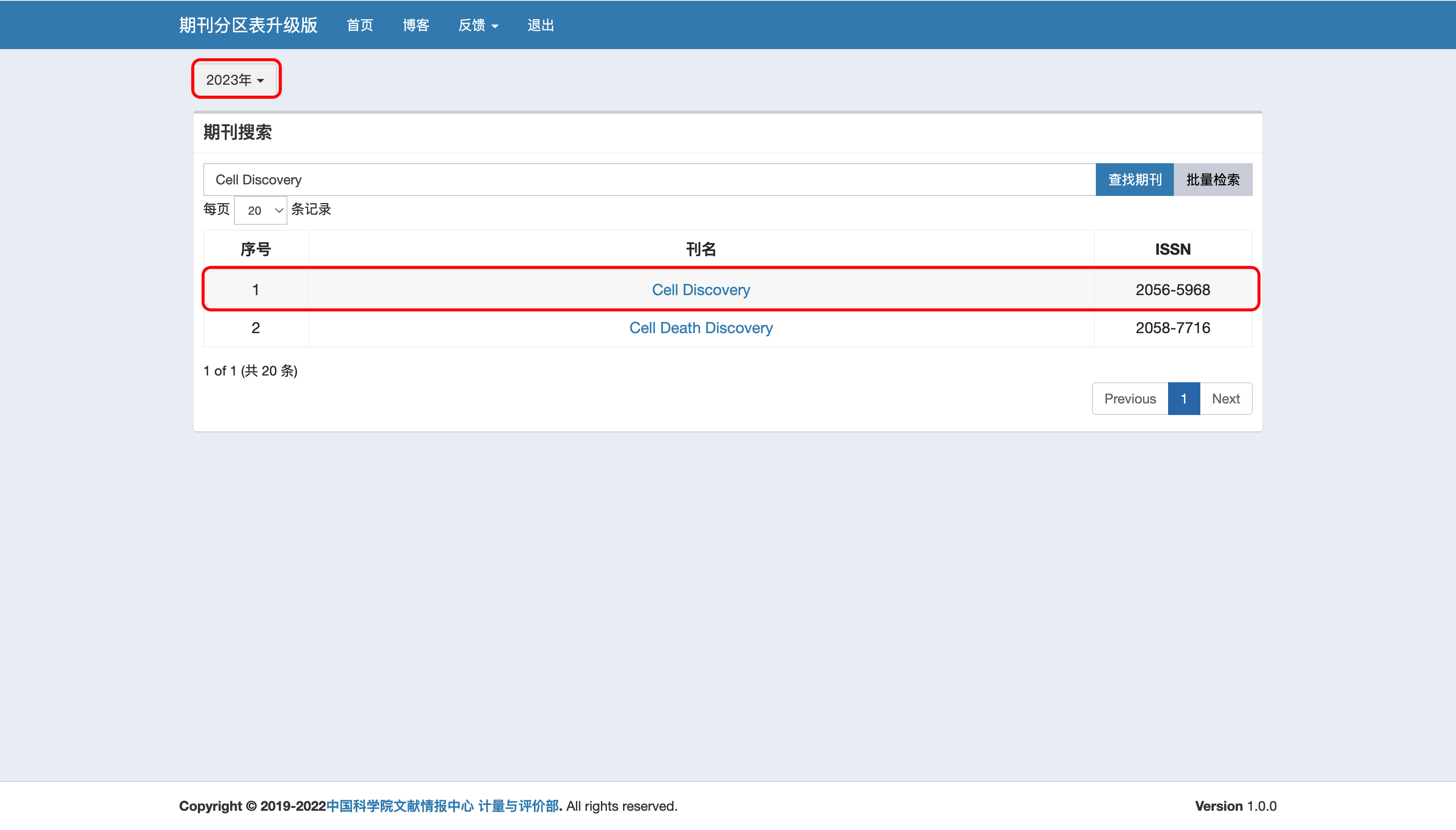 在中科院分区升级版网站检索到"Cell Discovery"期刊后,将年份设置为"2023"。
