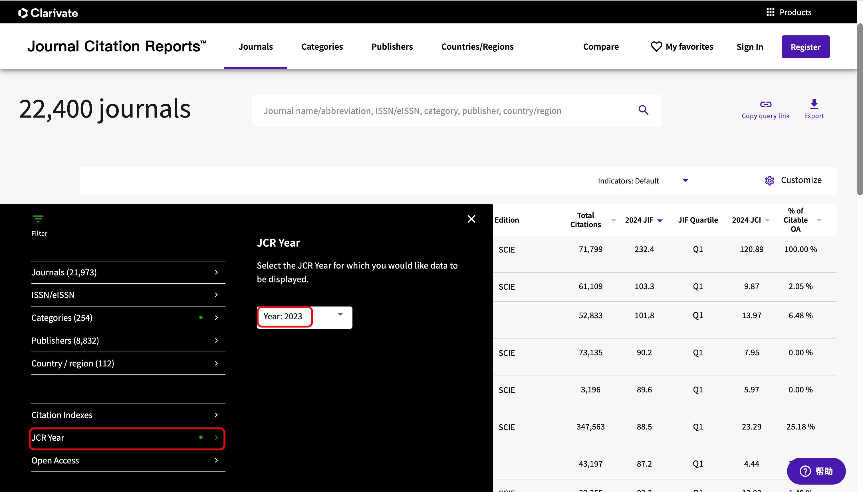 在JCR网站,设置"JCR Year"为"2023"。