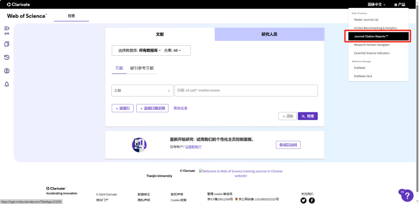 同样通过天津大学图书馆电子资源平台,登录后搜索InCites Journal Citation Reports(JCR)并跳转到对应网站。
