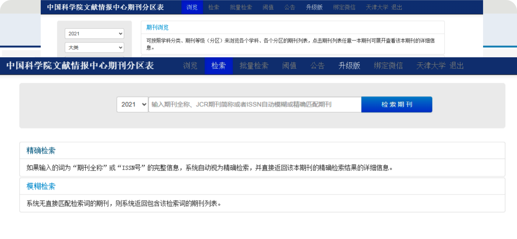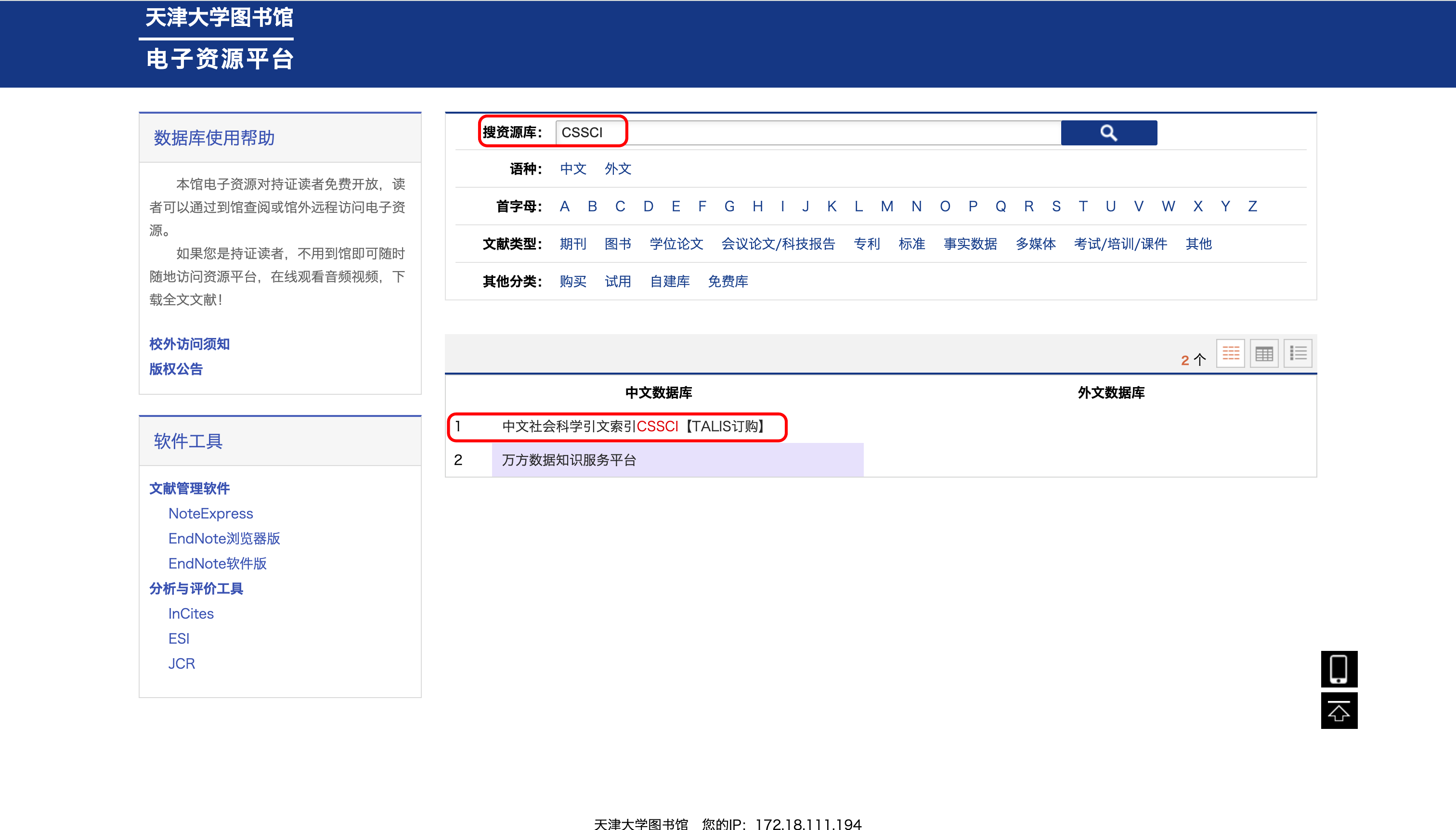 进入天津大学图书馆电子资源平台,登录后搜索CSSCI。网站地址:https://eds.tju.edu.cn/ermsClient/browse.do。