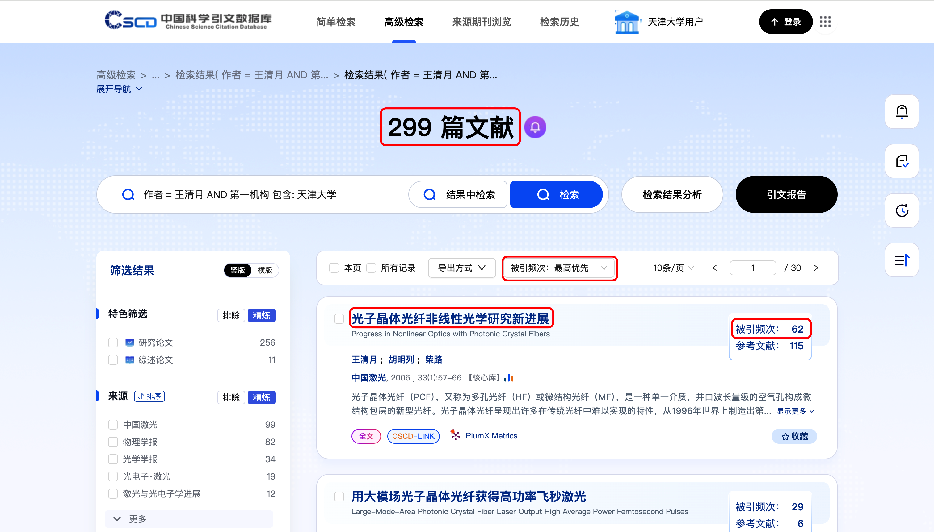 在检索结果页面,可以看到天津大学王清月老师在CSCD共有299篇文献(截止到2025-12-20)。进一步将排序方式设置为"被引频次"、"最高优先",可以看到该学者被引频次最高的一篇论文题目为《光子晶体光纤非线性光学研究新进展》,对应被引频次为62。