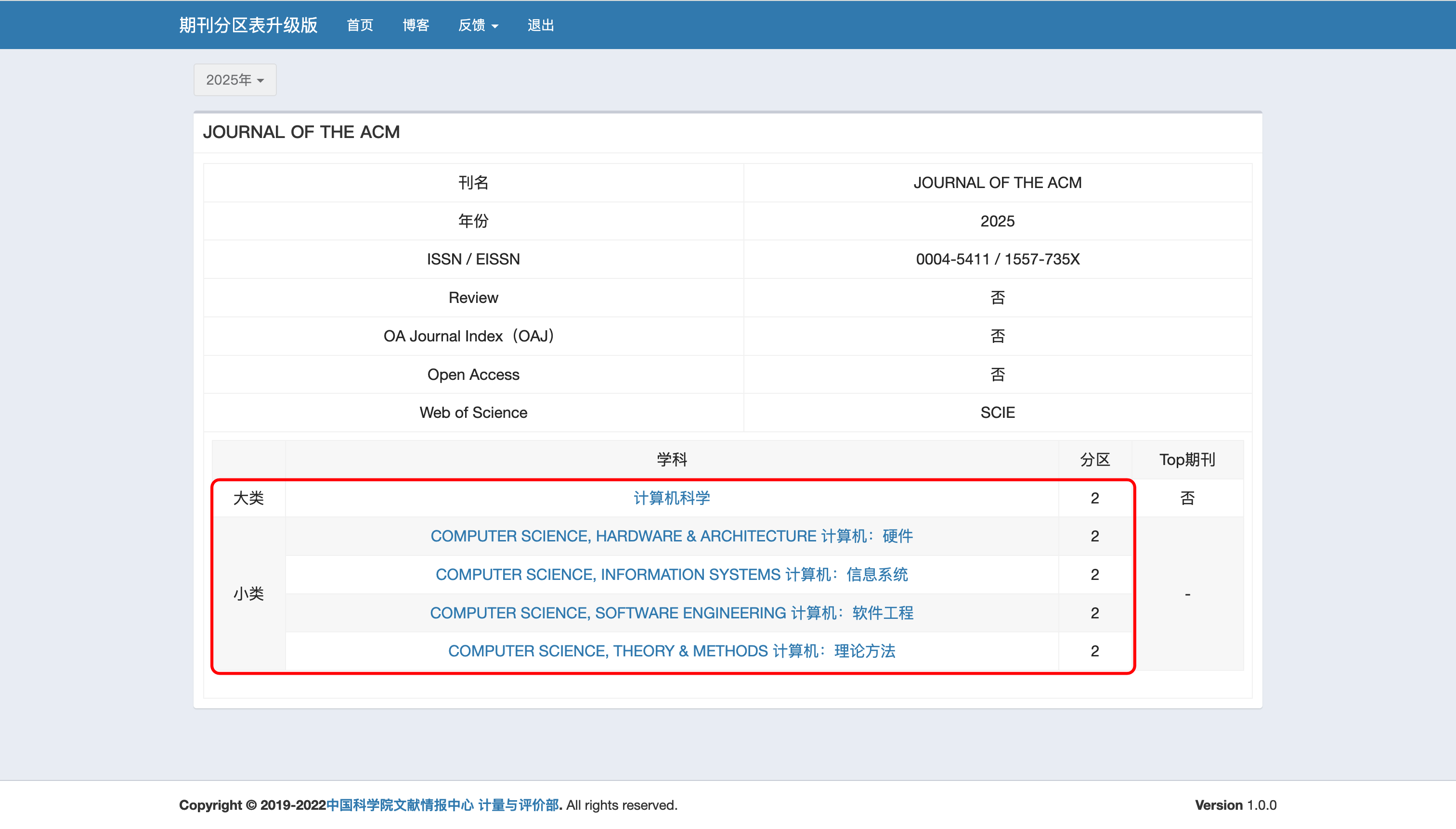在中科院JCR期刊分区表(升级版)网站,检索期刊"JOURNAL OF THE ACM"。