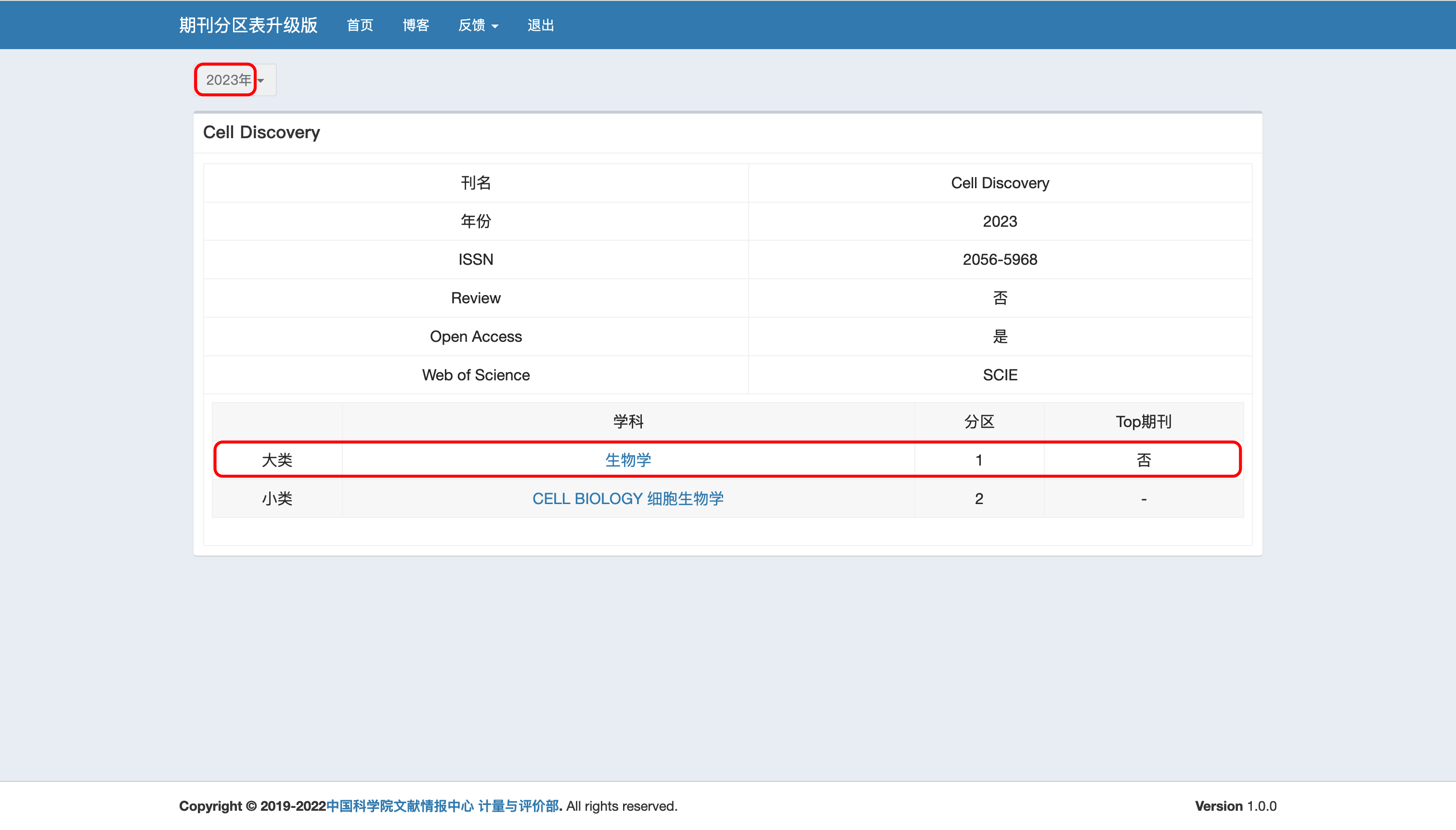 可以看到"Cell Discovery"这本刊物2023年中科院分区升级版的大类分区为生物学1区。