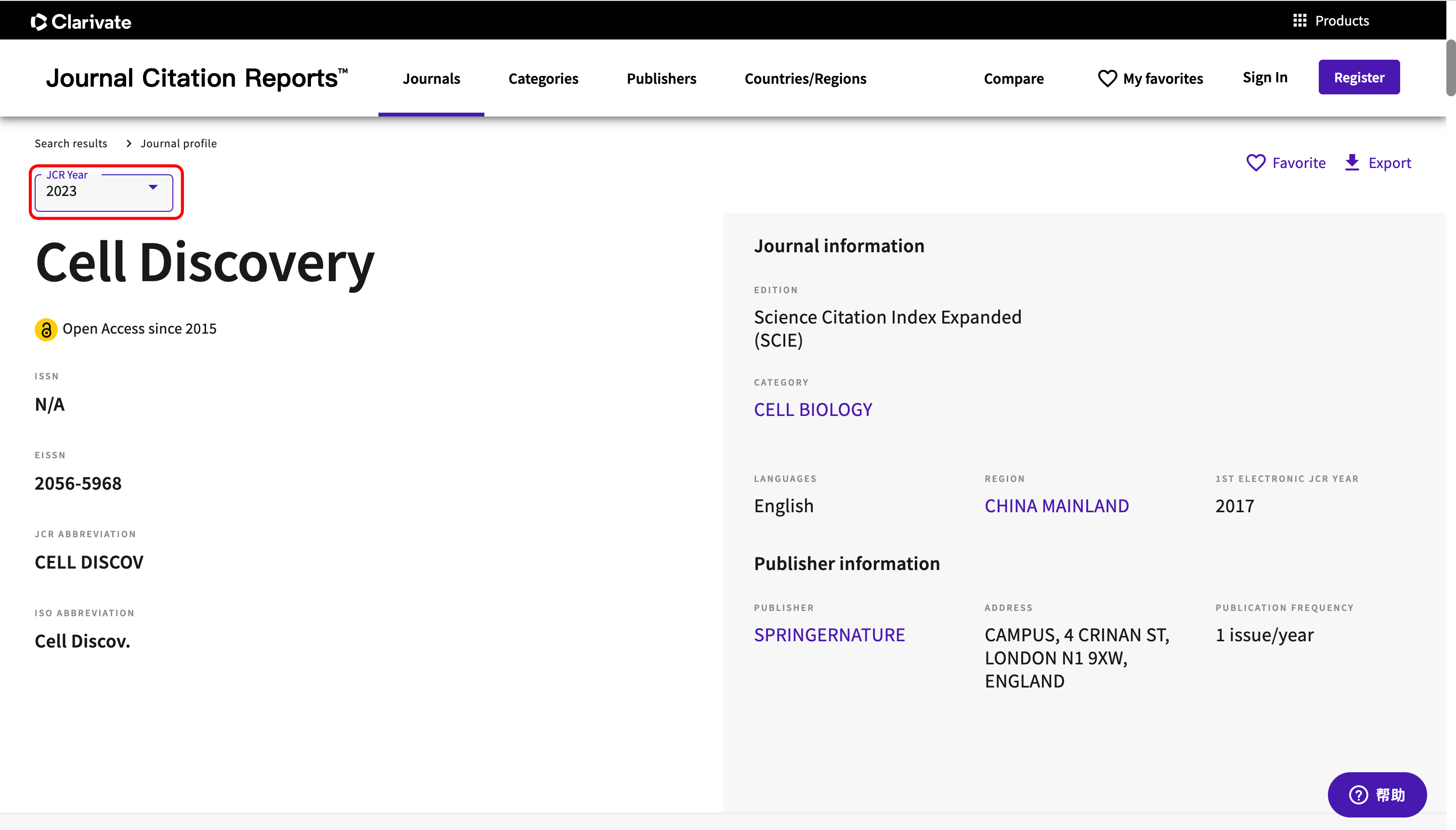 "Cell Discovery"这本刊物2023年的影响因子仍然在JCR网站查询,网站进入方法参考第3个练习。