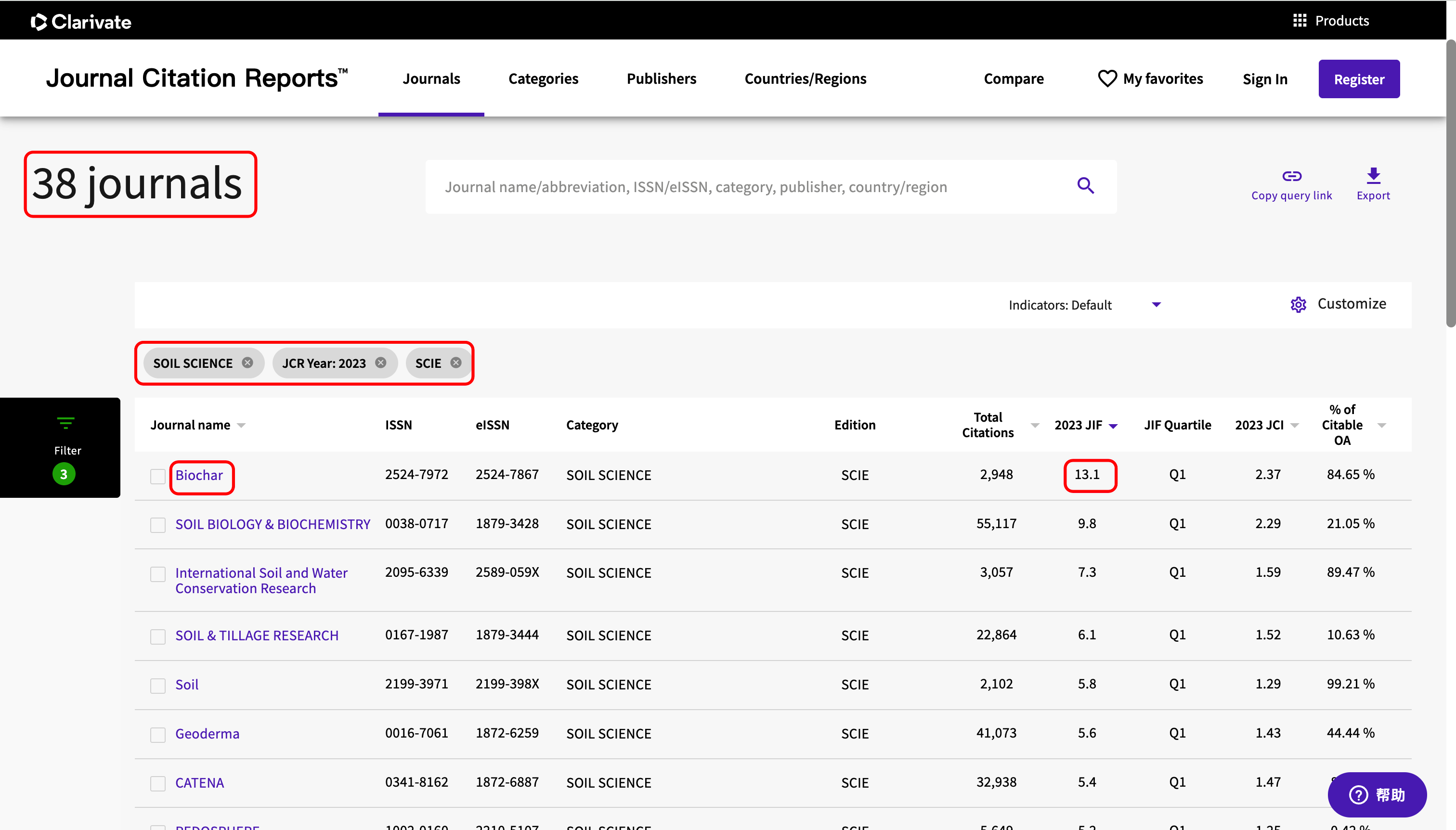 可以看到,在2023年SCIE刊源中,SOIL SCIENCE类别下SCIE刊源的期刊数量为38,其中影响因子最高的期刊为"Biochar"。