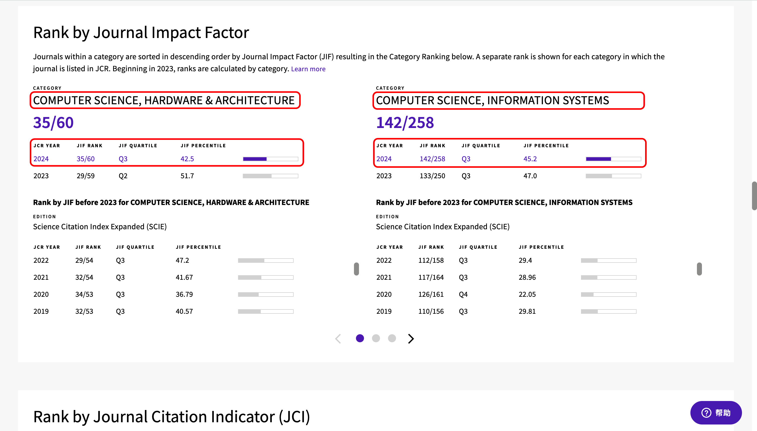 - 期刊"JOURNAL OF THE ACM"在InCites Journal Citation Reports(JCR)中对应的分区为Q3,对应学科类别包括:"COMPUTER SCIENCE, THEORY & METHODS"、"COMPUTER SCIENCE, SOFTWARE ENGINEERING"、"COMPUTER SCIENCE, HARDWARE & ARCHITECTURE"、"COMPUTER SCIENCE, INFORMATION SYSTEMS"。