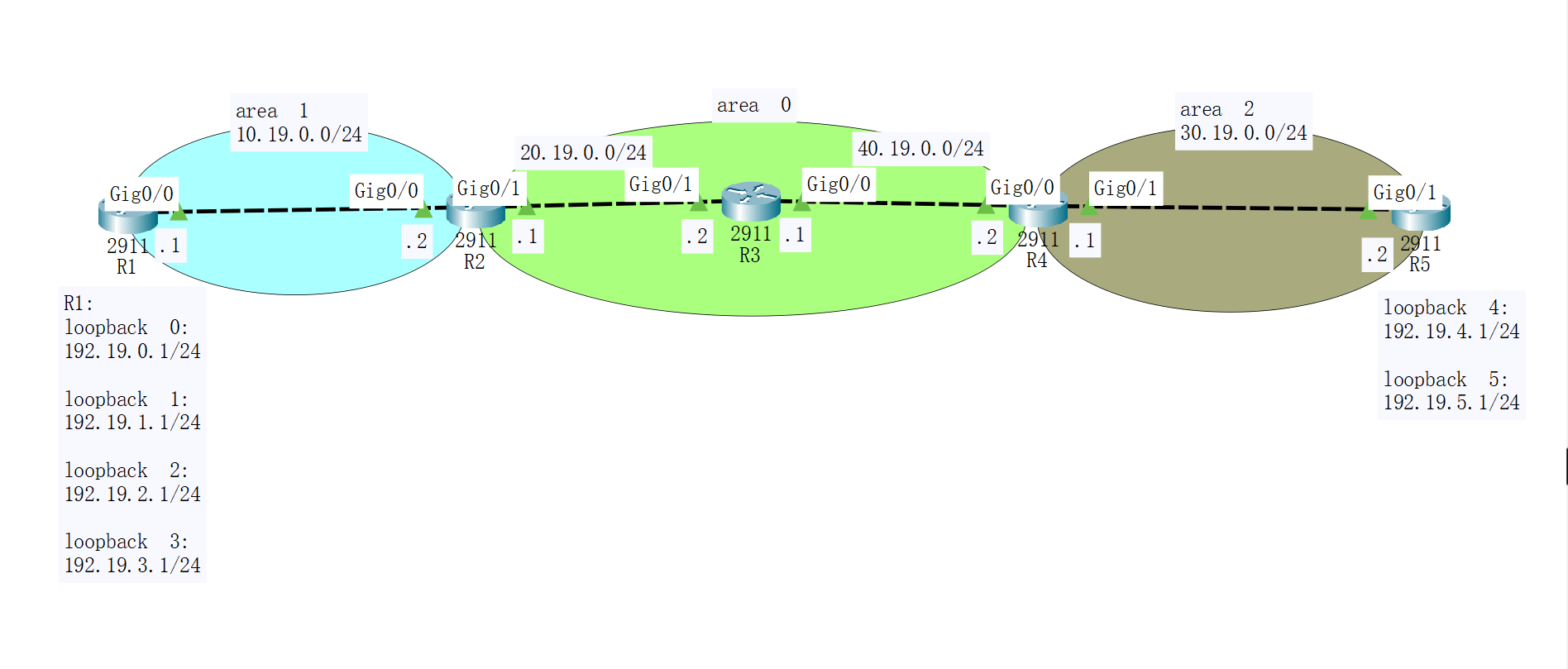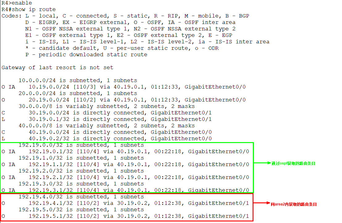 - 20.19.0.0/24以及40.19.0.0/24为 骨干 area 0 内的网段。