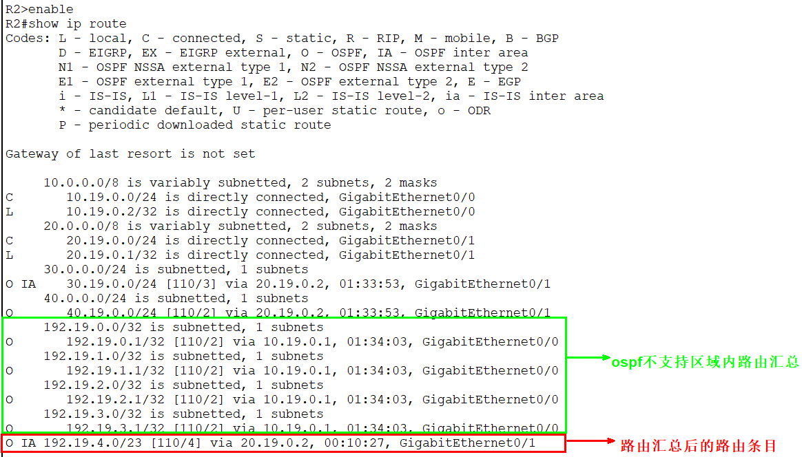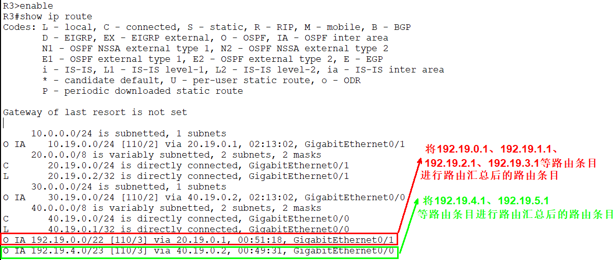 1、R3成功获取到将192.19.0.1、192.19.1.1、192.19.2.1、192.19.3.1汇聚为192.19.0.0/22的路由条目信息