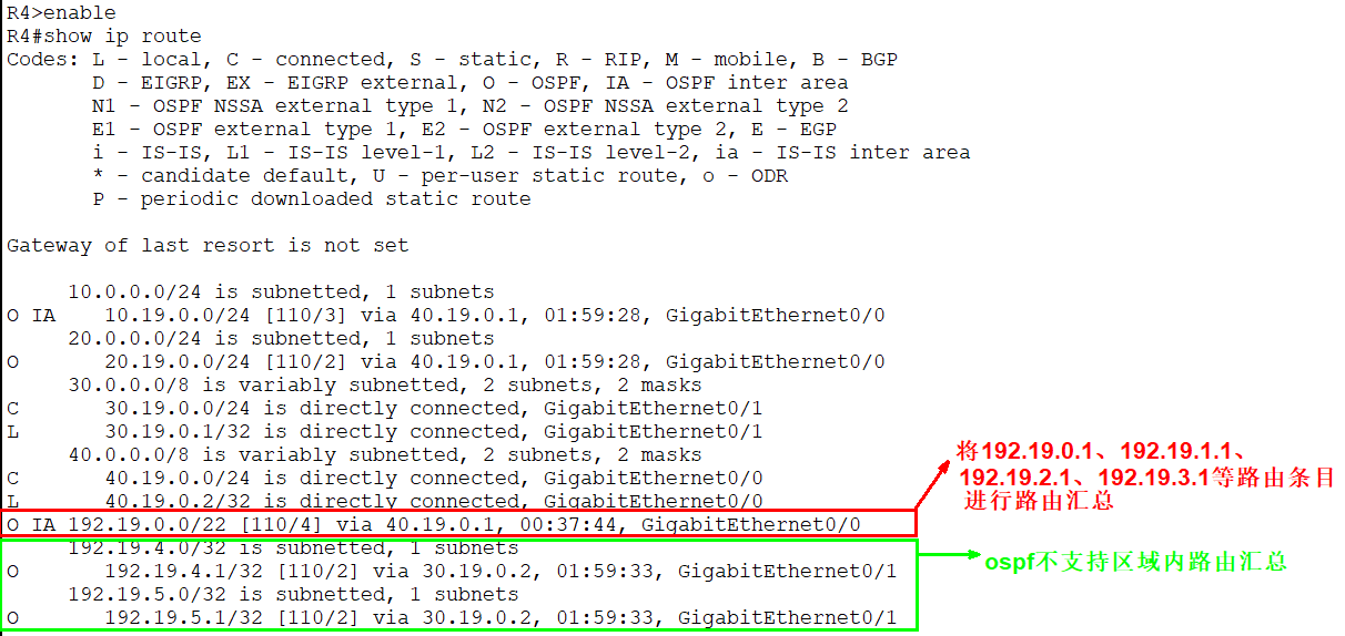 R4(config)#router ospf 1 R4(config-router)#router-id 4.4.4.4 R4(config-router)#area 2 range 192.19.4.0 255.255.254.0 R4(config-router)#exit R4(config)#exit R4#write memory
