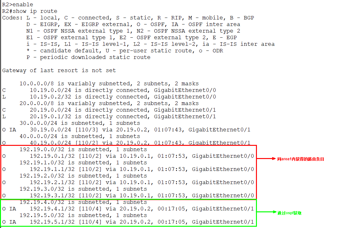 - R2上有 area1 内的路由明细以及通过ospf获取得到的路由条目;