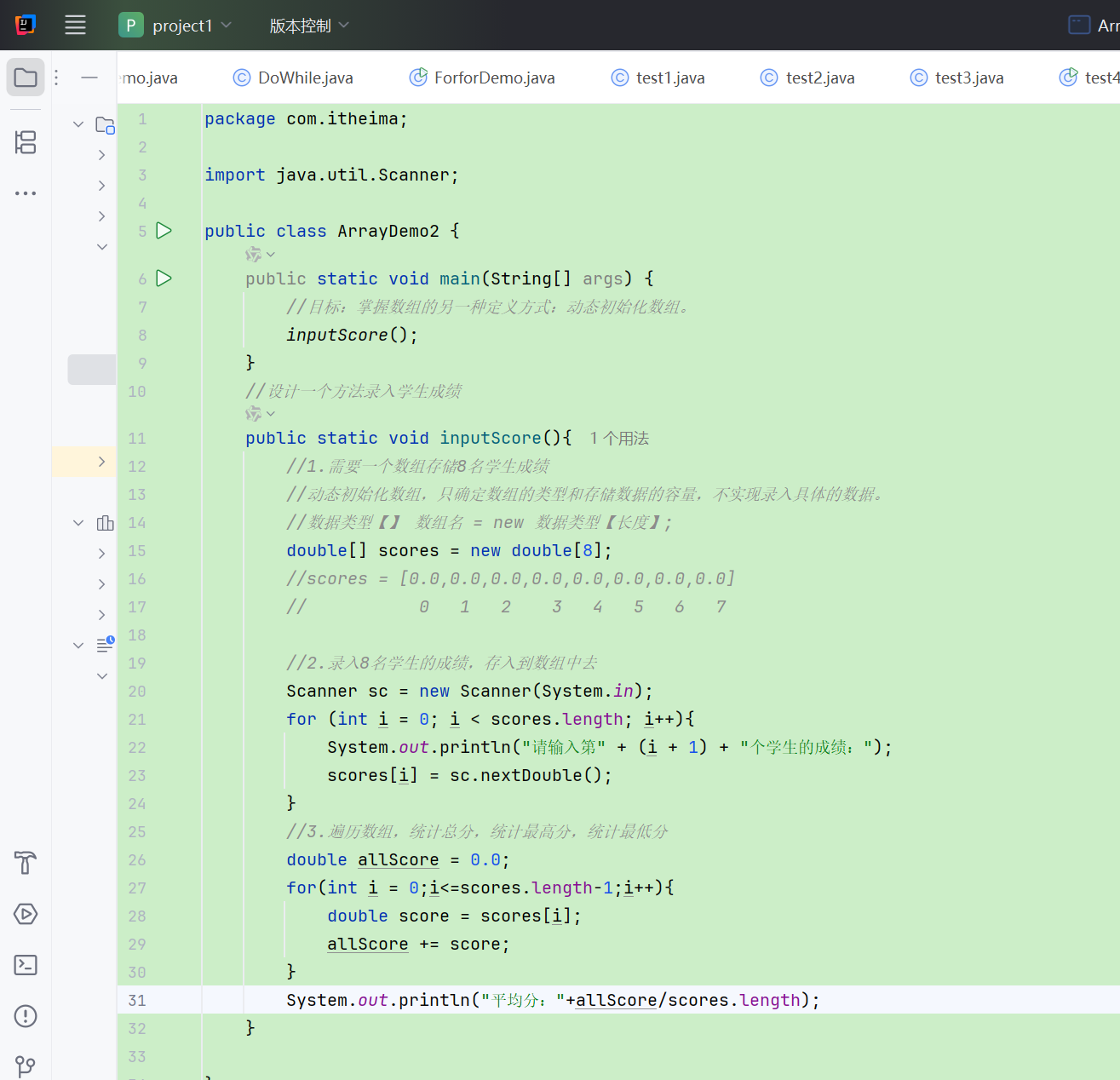- 遍历数组,将数组中每个数据赋给score,score累加