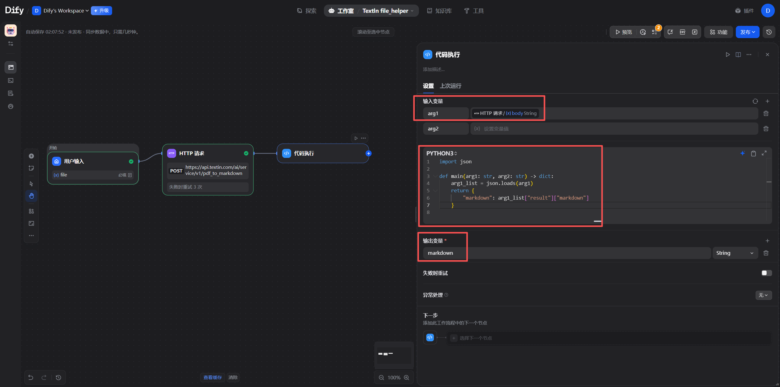 虽然 TextIn 返回了结构化的 Markdown 文本,但它被包裹在复杂的 JSON 结构中。为了让后面的大模型节点能够直接处理文本,需要通过代码执行节点进行一次精密的"手术"。