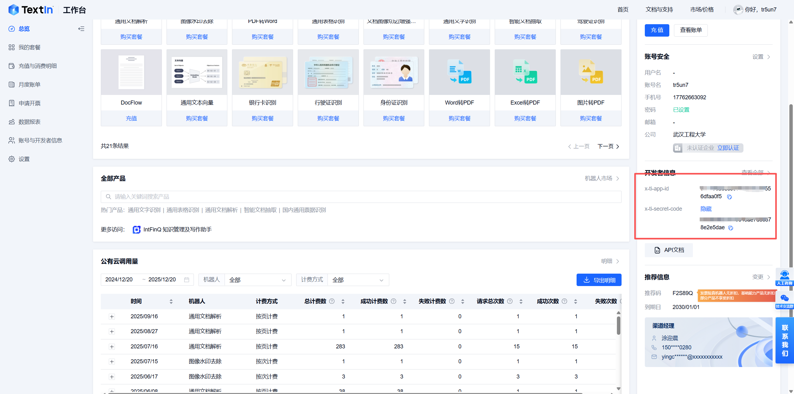 为了让这个信使获得访问权限,开发者需要前往 TextIn 的开发者后台获取专属的身份凭证。