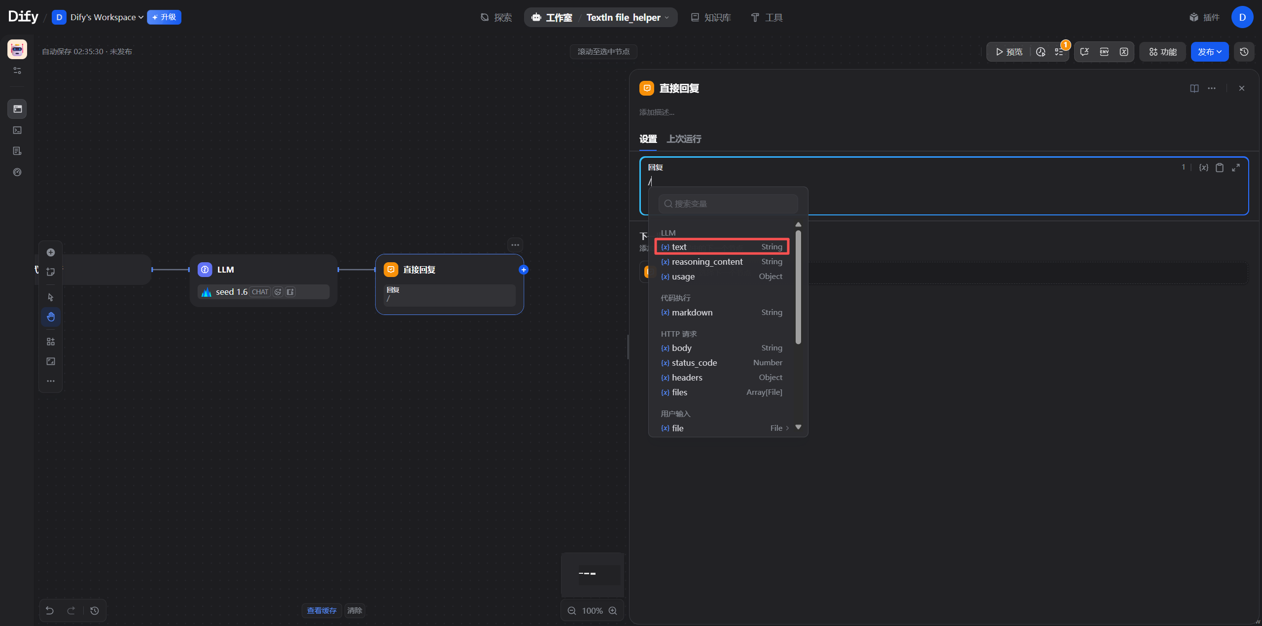 这个节点作为工作流的终点,会将 LLM 节点生成的精炼内容直接反馈给用户。
