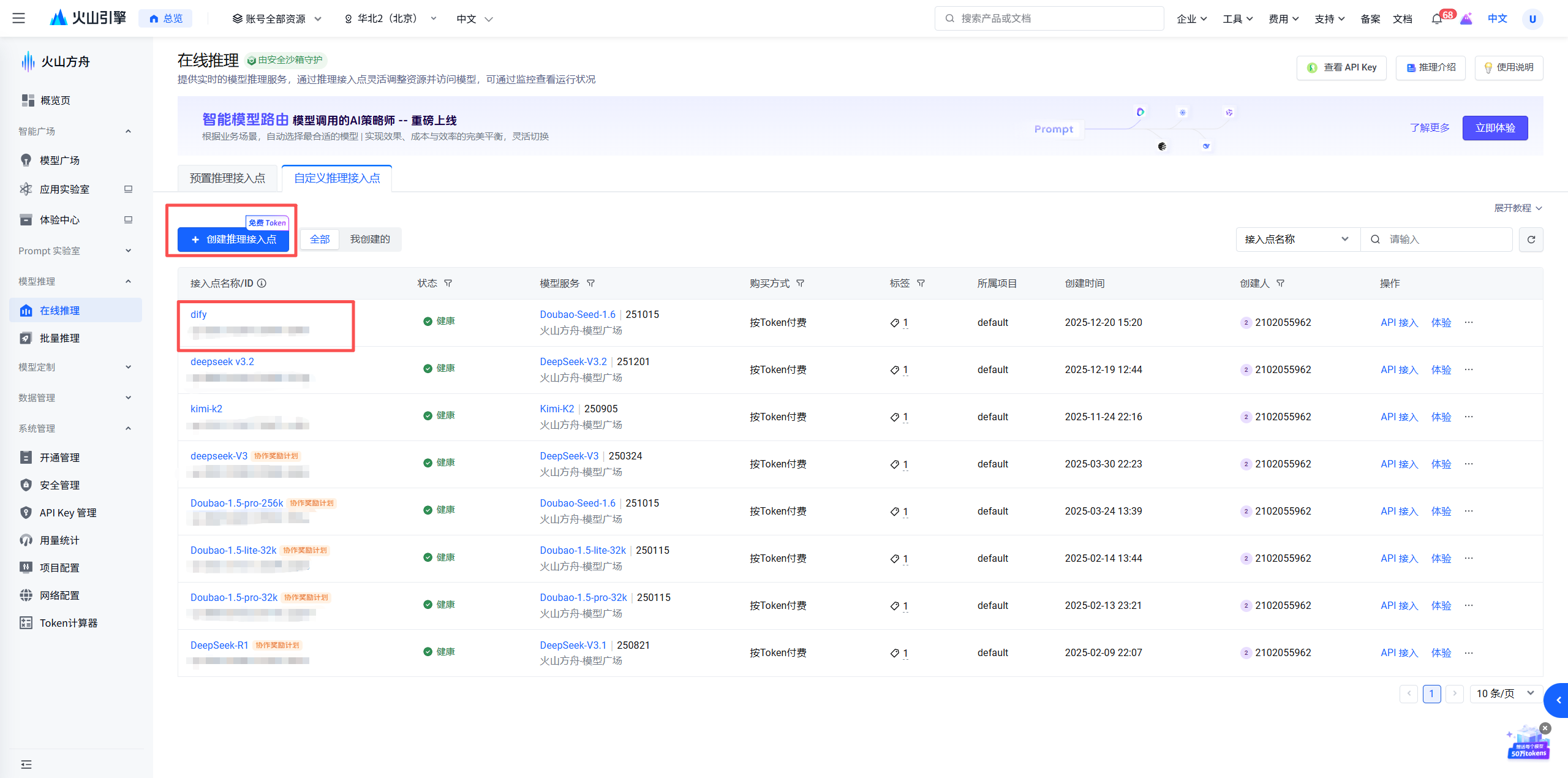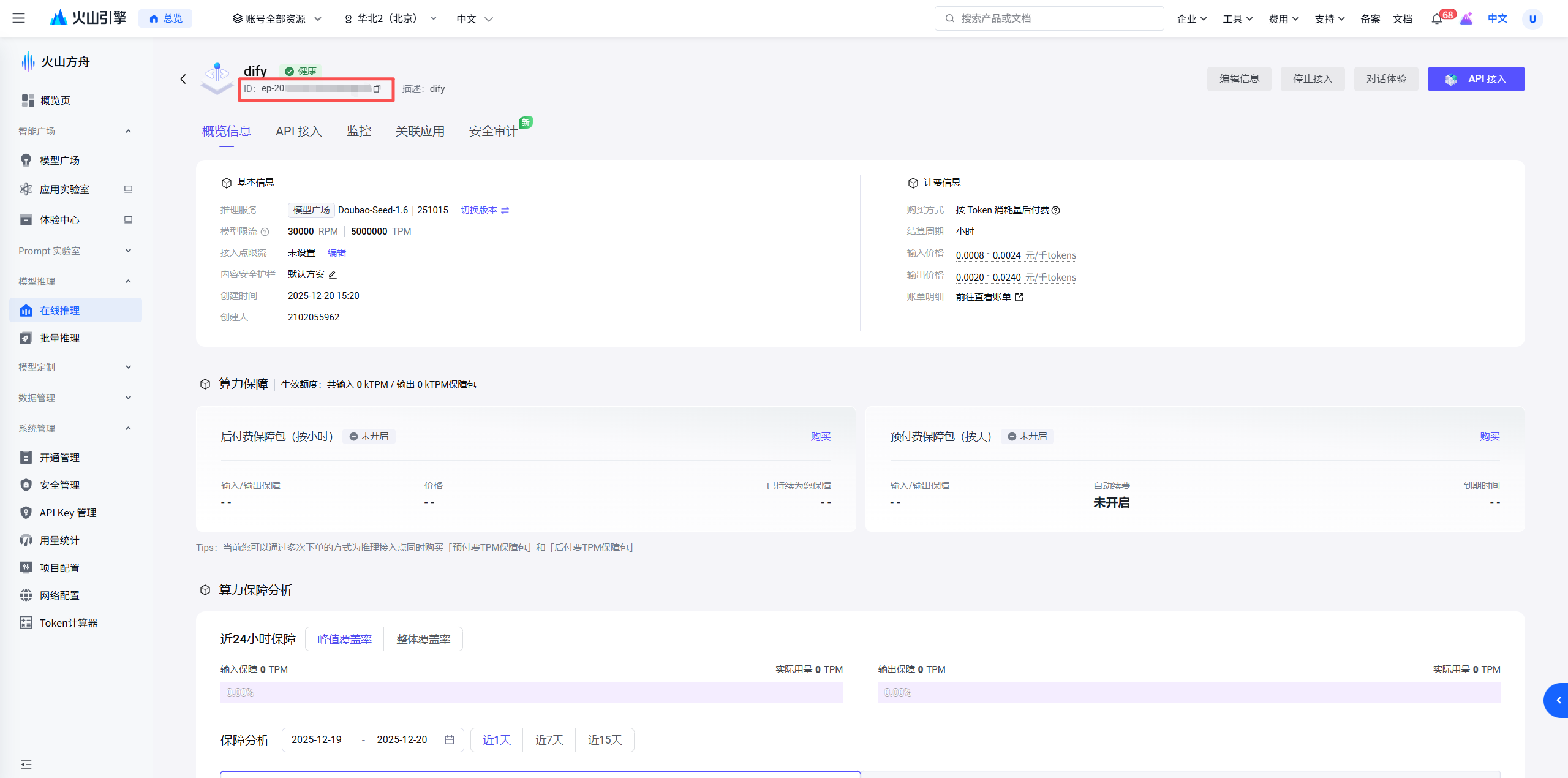 创建完成后,系统会生成一个 Endpoint ID。这个 ID 是唯一的,它是 Dify 节点在互联网中寻找火山引擎模型实例的精准坐标。