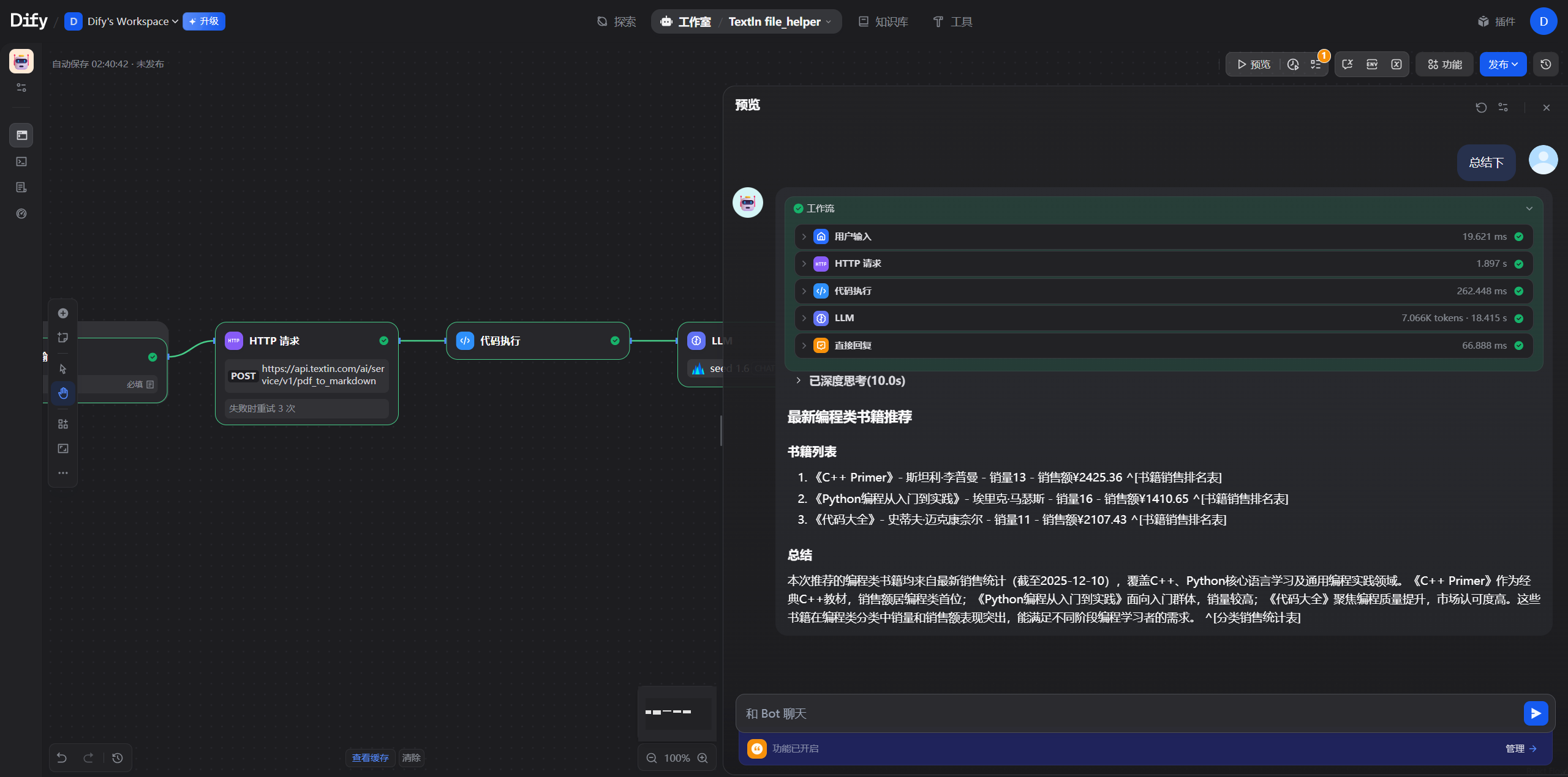 最终的运行效果令人满意。AI 不仅准确提取了报表中的图书信息,还对其销售情况进行了分类总结,完全符合在提示词中定义的专业风格。整个流程从文件上传到结果输出,一气呵成。