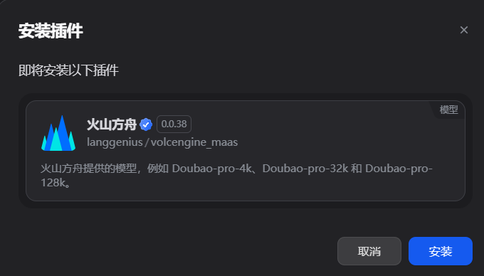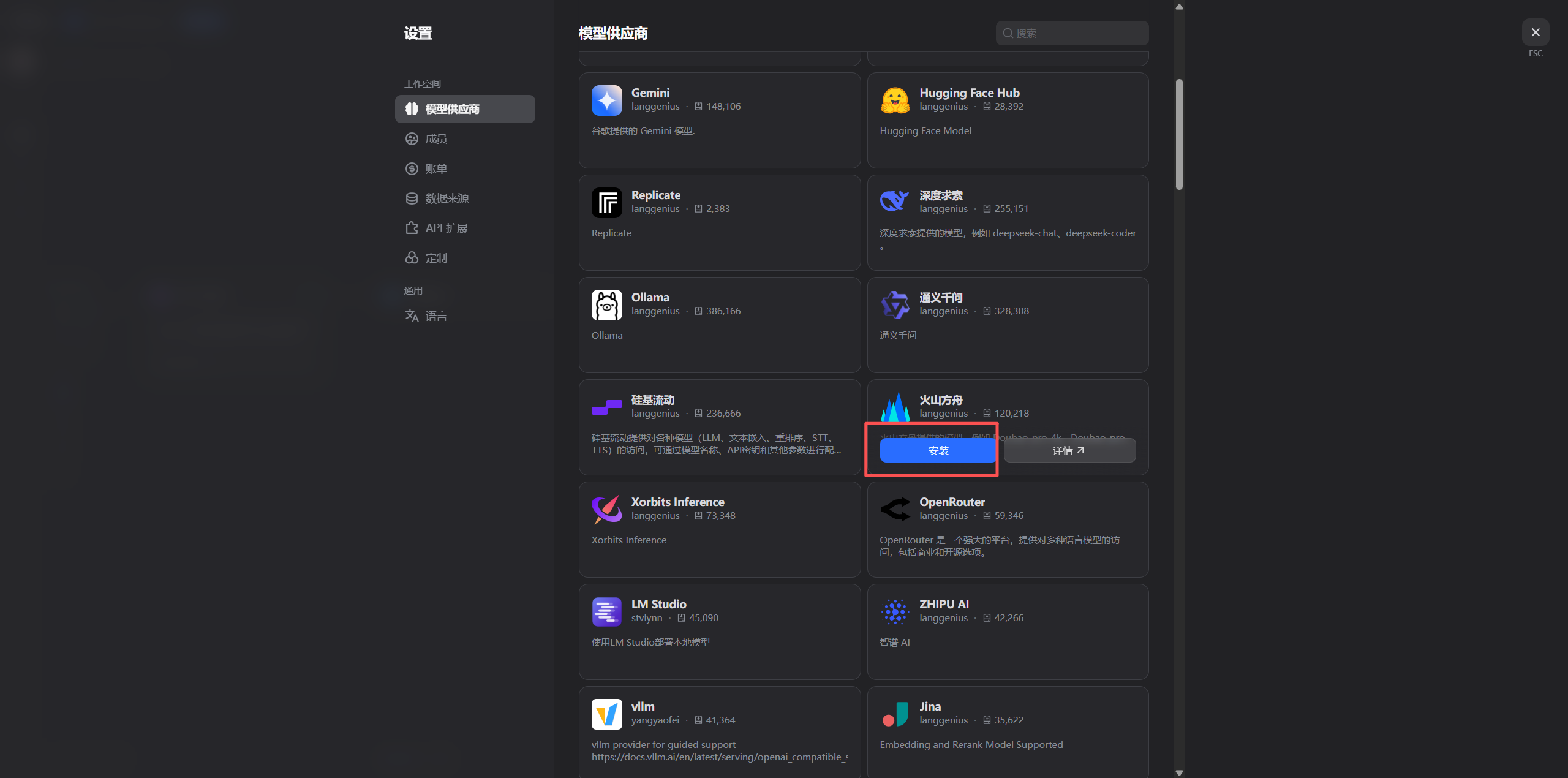 点击火山方舟的供应商卡片,系统会提示安装相关插件或驱动。这是连接 Dify 环境与火山引擎云端算力的桥梁。