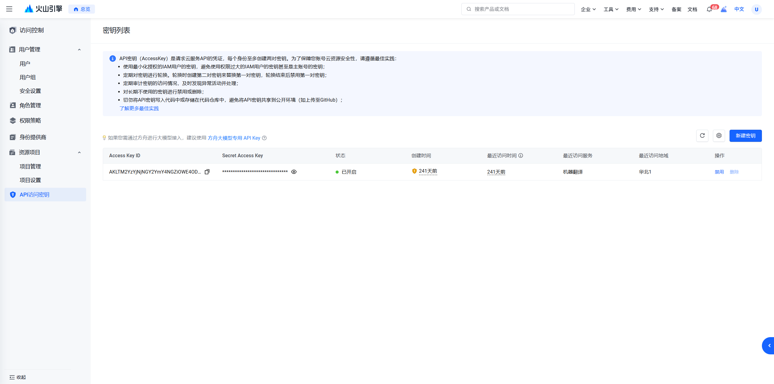 在火山引擎的 IAM(身份访问管理)控制台中,可以找到密钥管理页面。通过点击"创建访问密钥",系统会生成一对 Access Key 和 Secret Access Key。这两个密钥的作用是代表开发者本人向火山引擎请求模型推理服务。完成创建后,需要将这些敏感信息复制并妥善保存。