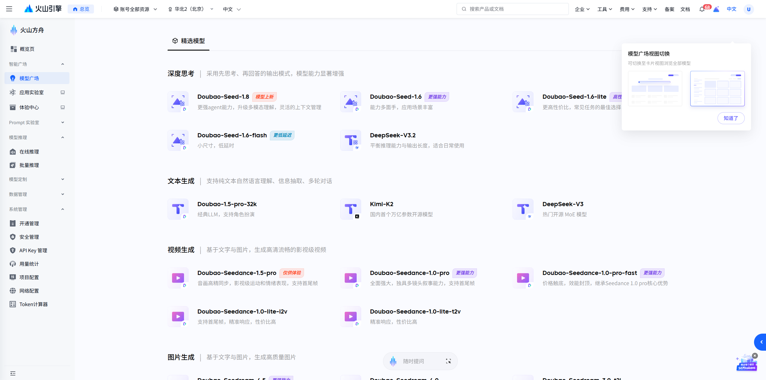 有了密钥后,还需要在火山引擎的模型广场选择具体要使用的模型。