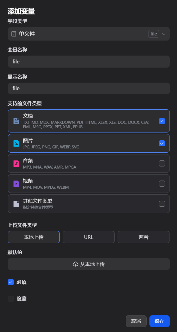 深入到字段定义的细节,可以看到变量名称被命名为 file。在字段类型的下拉菜单中,专门选择了"单文件(文档/图片)"这一选项。在下方的开关中,开启了对图片和文档的支持。这意味着无论是扫描产生的 JPG 图片,还是电子版的 PDF 文档,都可以通过这个入口被工作流捕获。这一设置确保了后续的 TextIn 节点有稳定的素材来源。