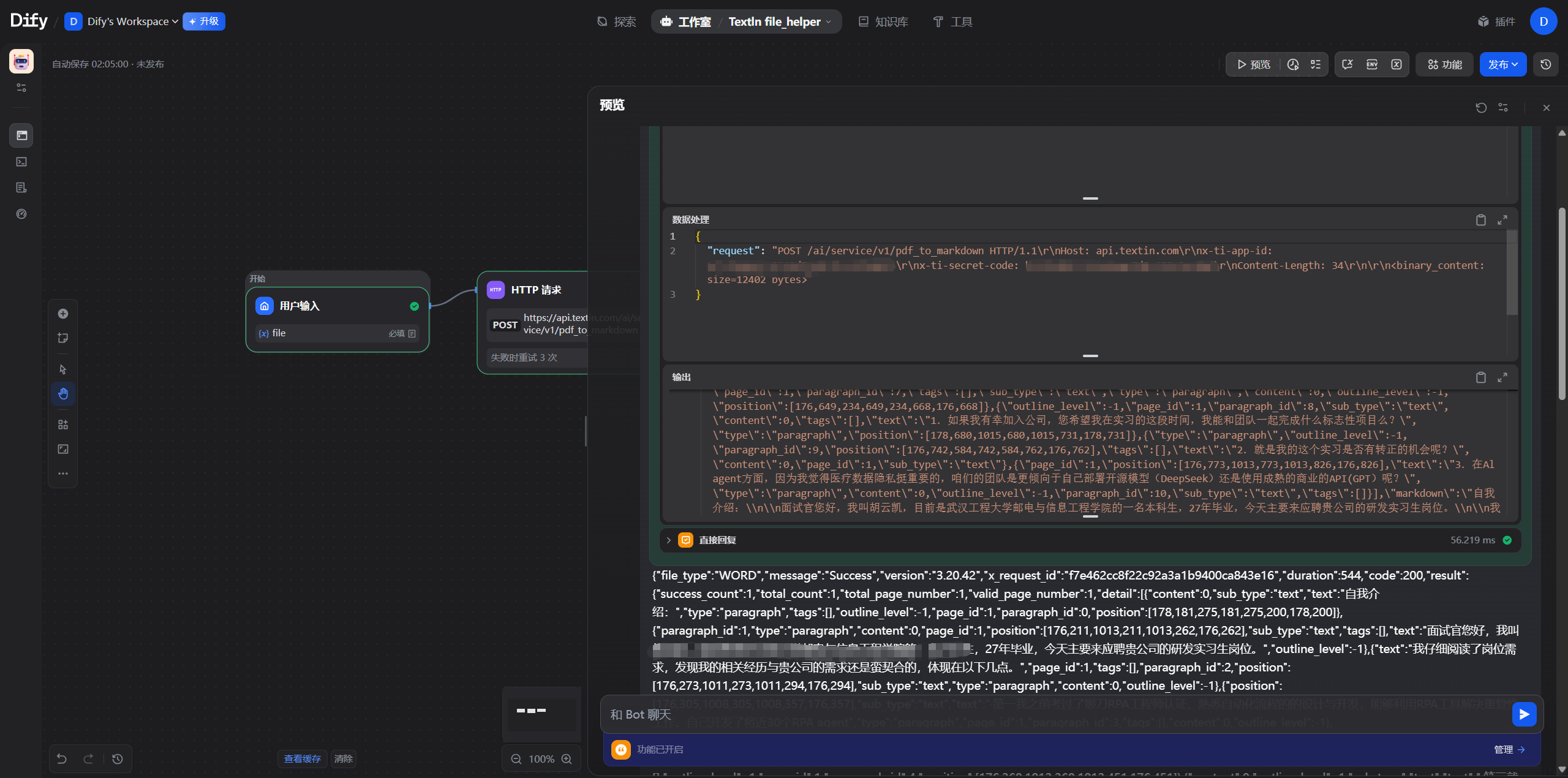 进入预览测试界面,右侧操作面板会出现文件上传区域。在这里上传一份准备好的测试文档,点击运行。系统会立即触发 HTTP 请求,将文件流推送到 TextIn 服务器进行处理。这个过程模拟了真实用户的操作流向。