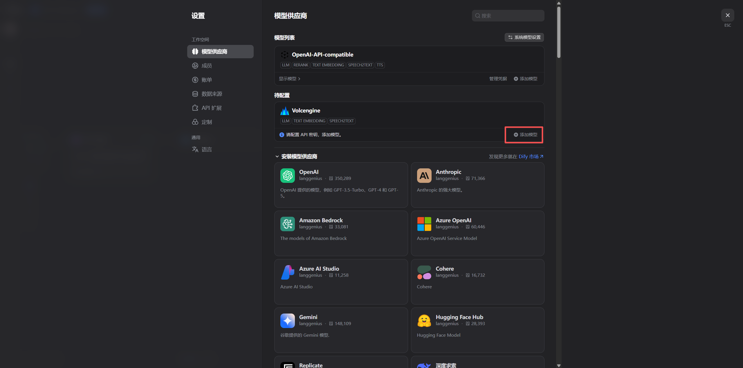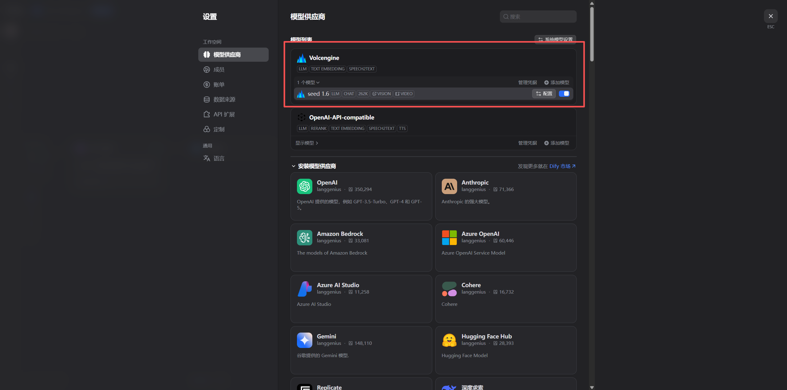在 Dify 的模型供应商管理界面,可以看到来自全球的主流模型厂商。为了接入豆包模型,需要向下滚动找到火山引擎(Volcengine)的标识。