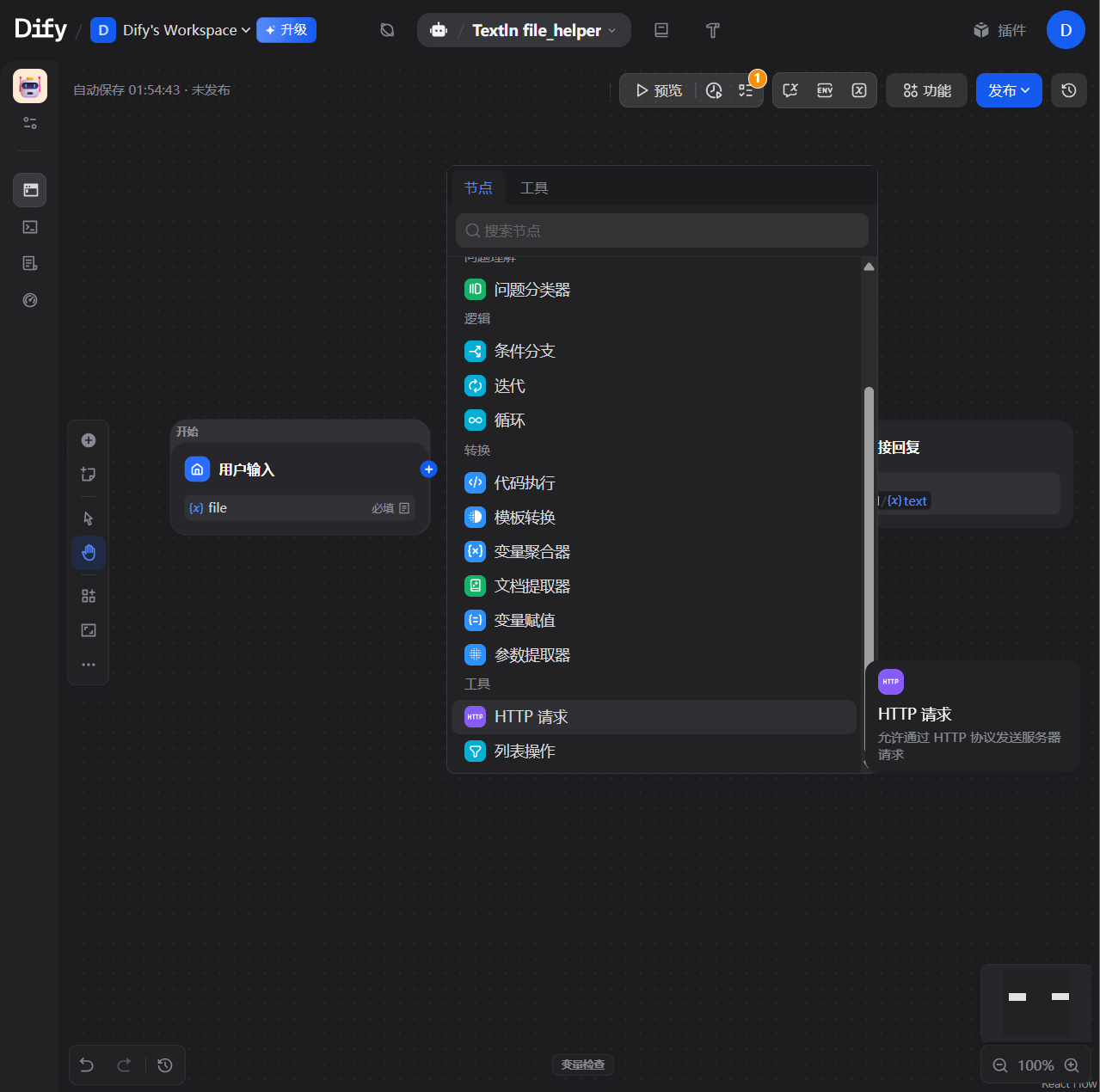 在工作流画布中,点击"开始"节点右侧的加号,系统会弹出组件搜索框。在这里选择"HTTP 请求"节点,该节点的作用是通过标准网络协议与 TextIn 的服务器进行数据交换。它就像一个信使,带着用户上传的文件去寻找专业的解析引擎。