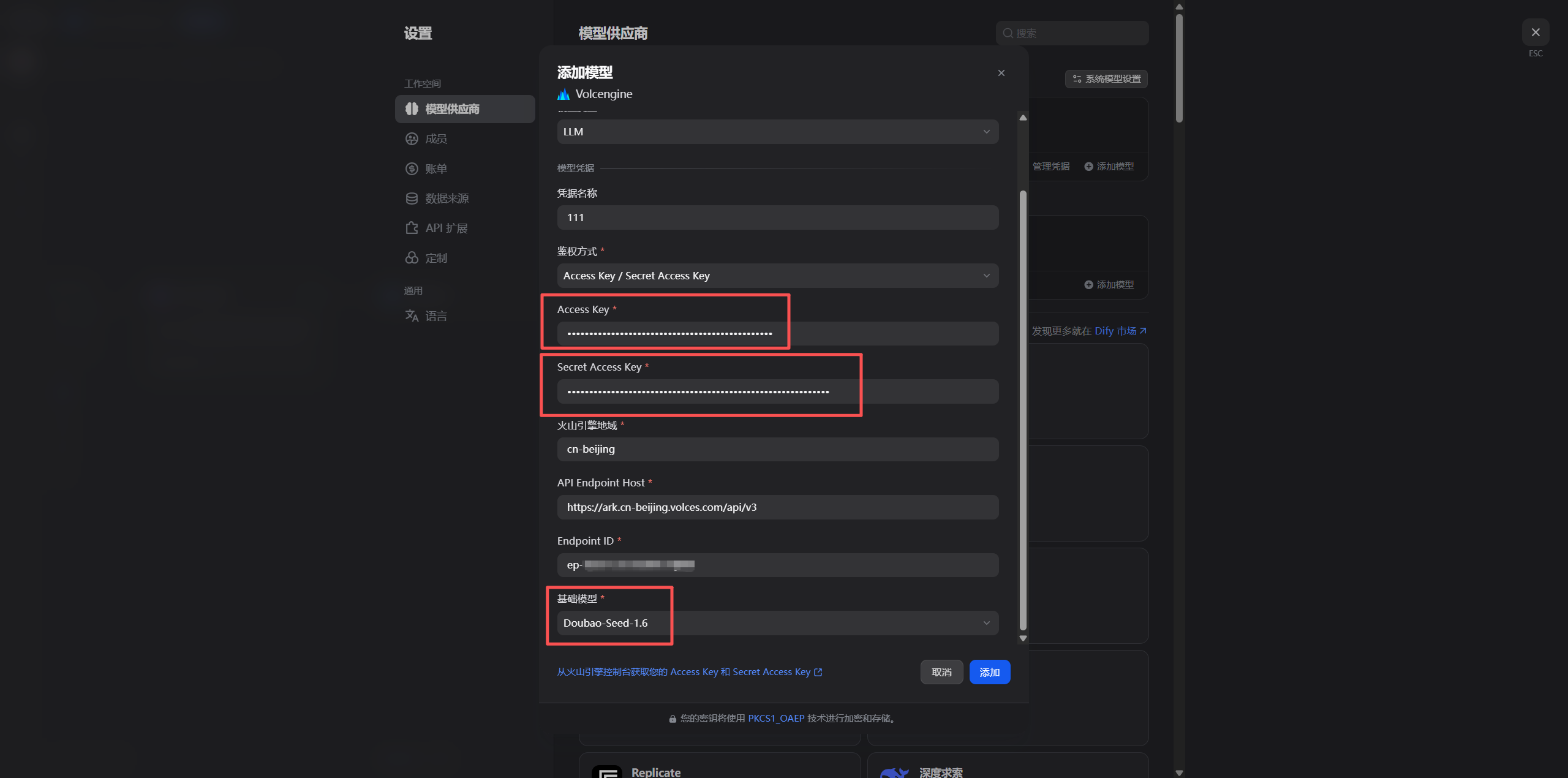 在配置弹窗中,开发者需要填写三个关键信息:自定义的模型名称、刚才获取的 Endpoint ID 以及 Access Key 信息。