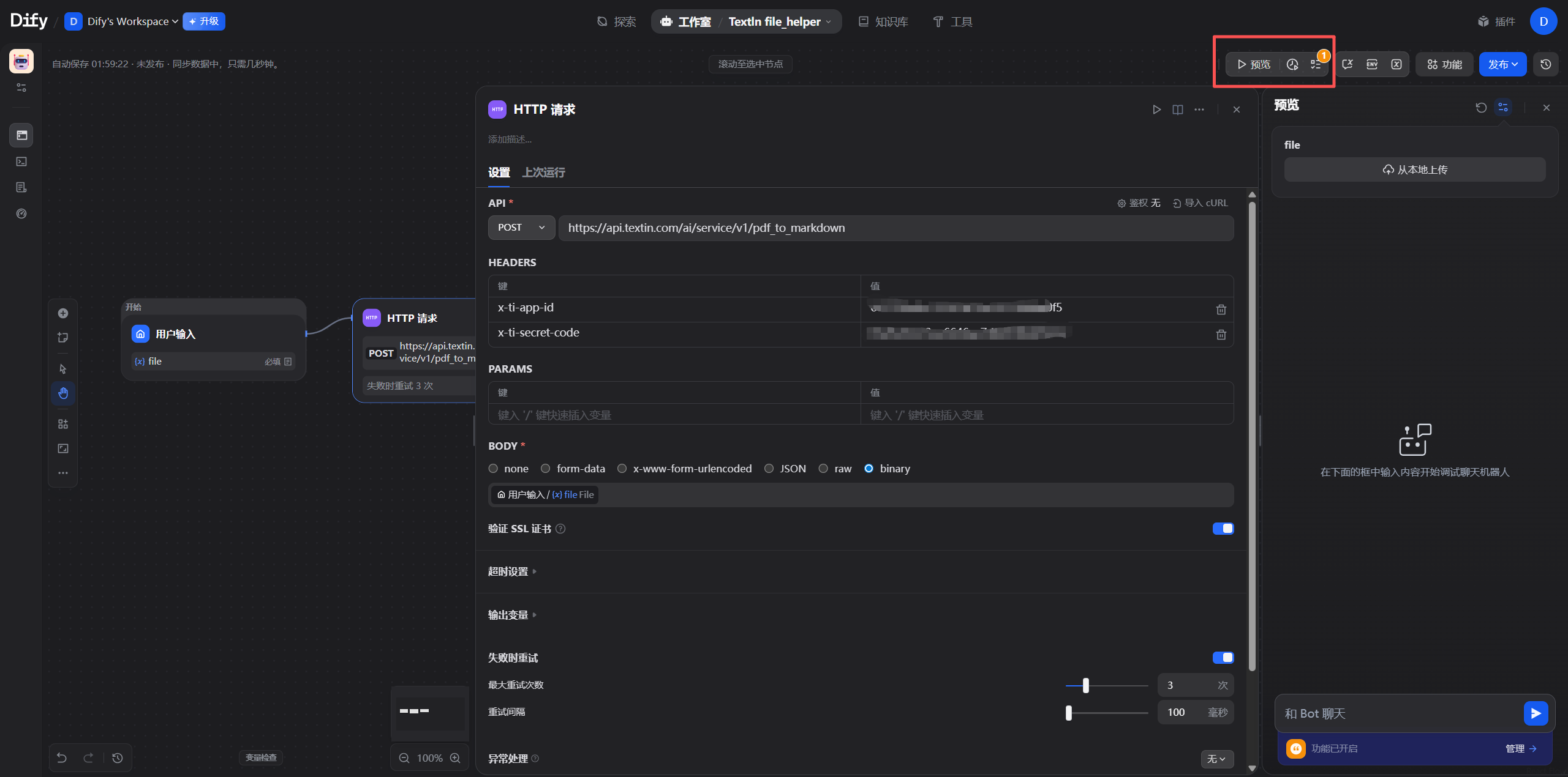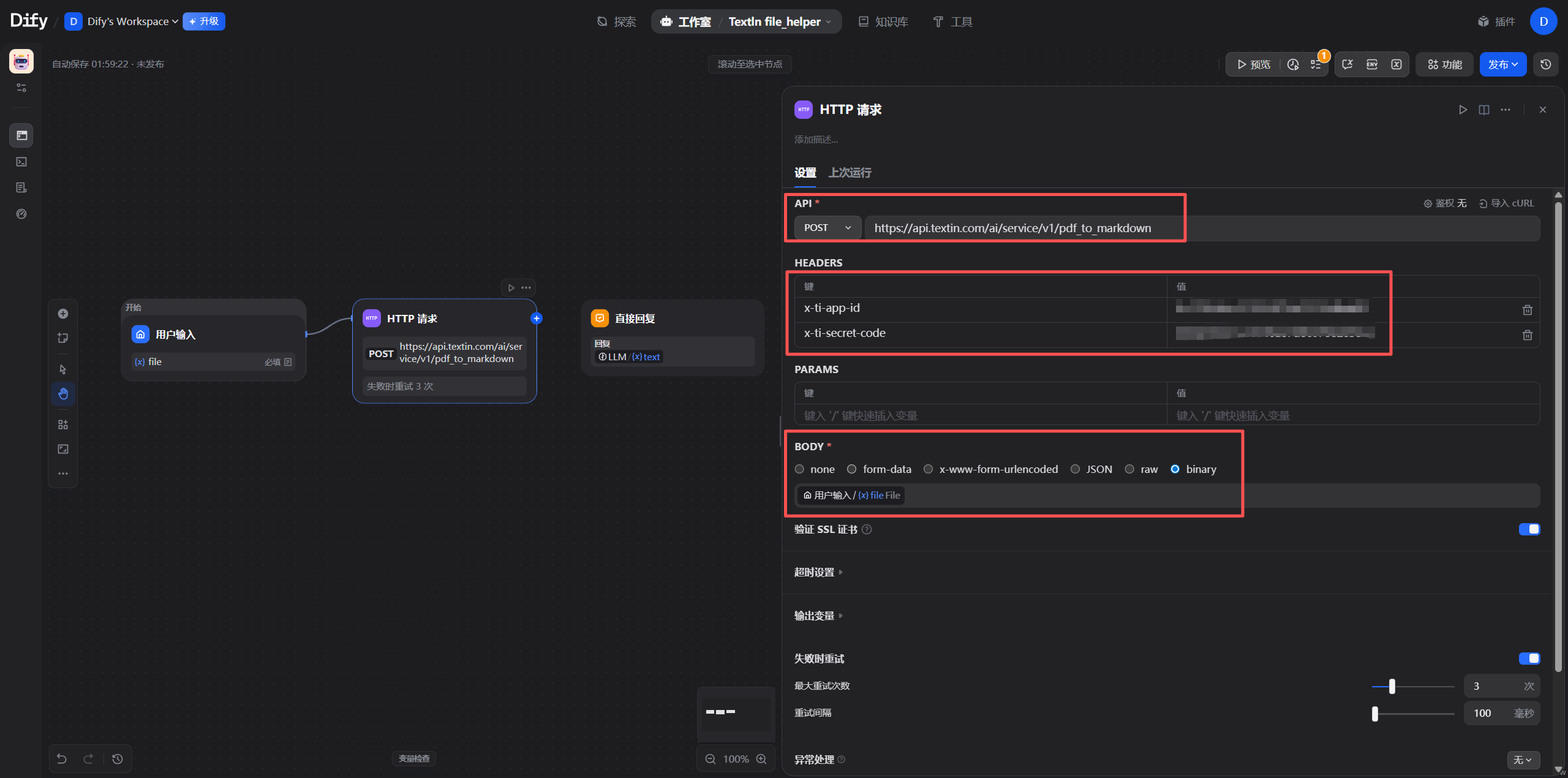 拿到这些凭证后,回到 Dify 平台,在 HTTP 请求节点中进行精确的配置。