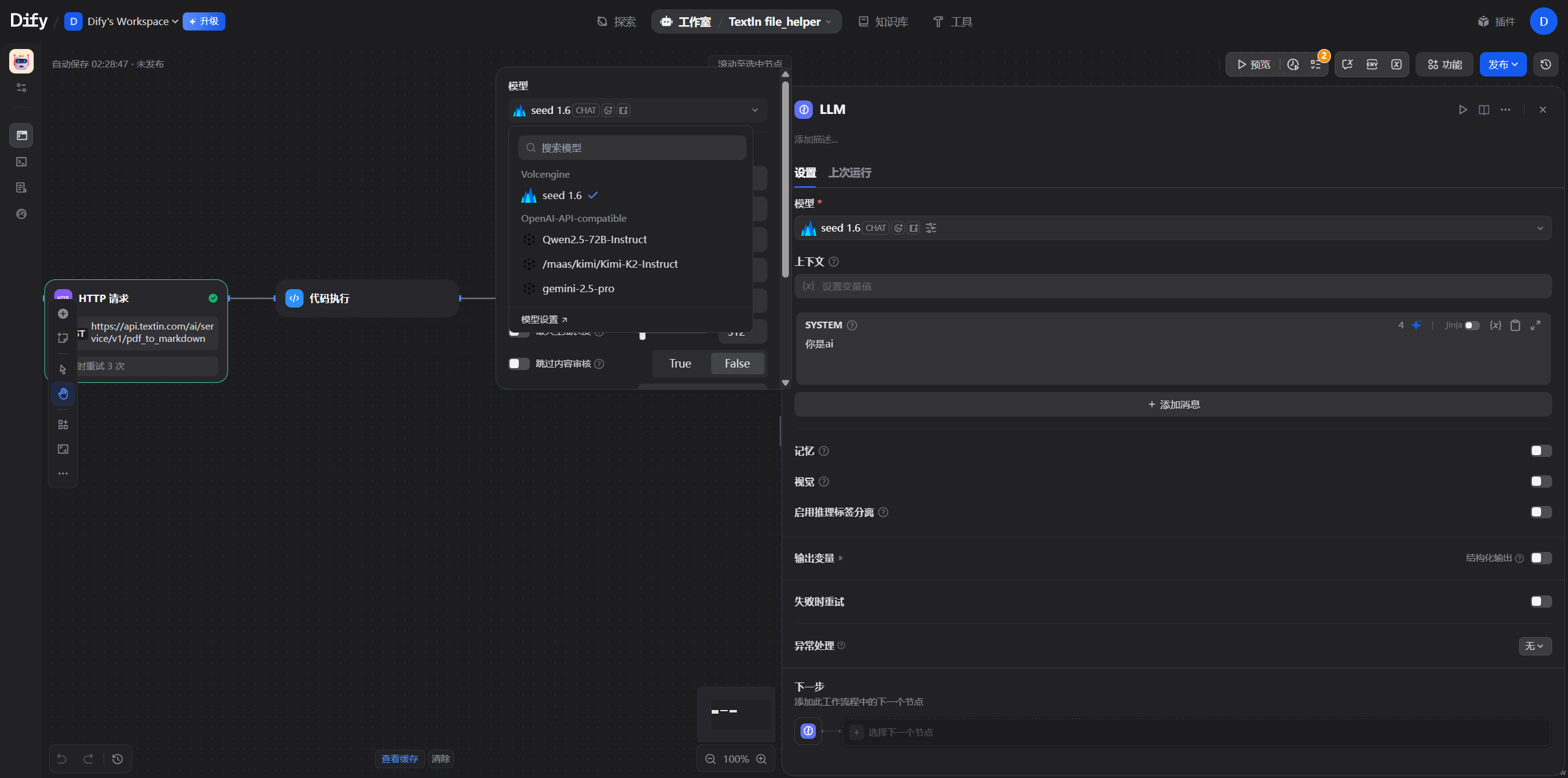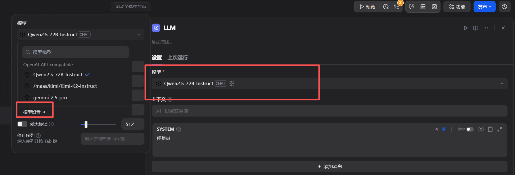 回到 Dify 工作流画布,在 LLM 节点的设置面板中,从模型列表中选中刚刚配置好的火山引擎模型。