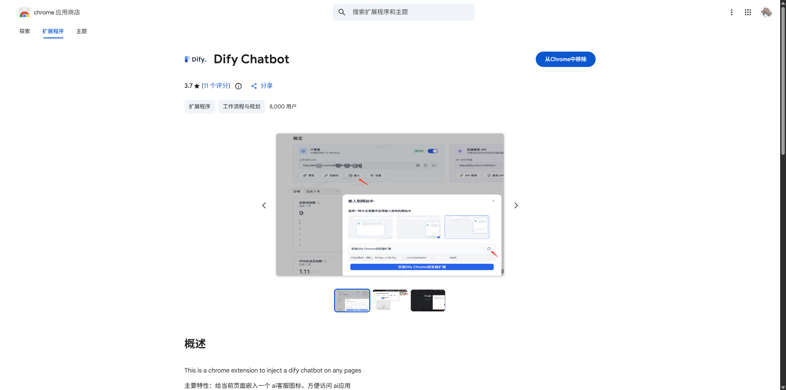 在谷歌浏览器插件商店中下载 dify chat bot 扩展工具。这个工具允许我们将 Dify 平台上的工作流直接转化为浏览器侧边栏的智能助手。