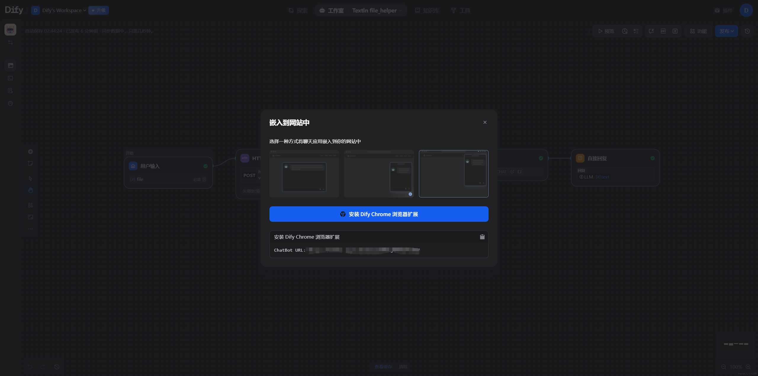 在 Dify 的发布选项中,复制 Web 访问链接,并将其填入插件的设置面板中。