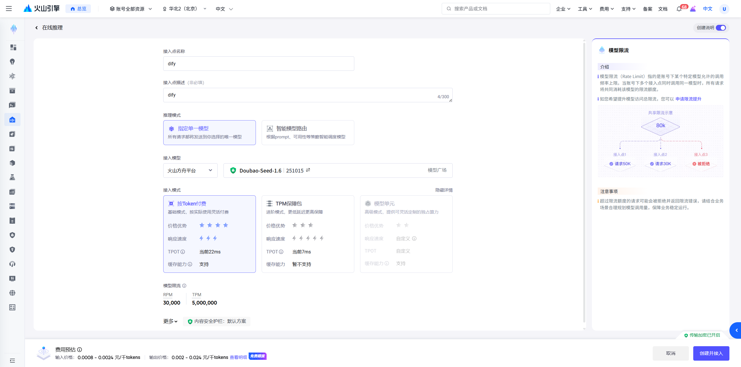 选定模型后,需要创建一个"推理接入点"。这相当于在火山引擎的服务器上为这个应用开辟一个专属的通信频道。