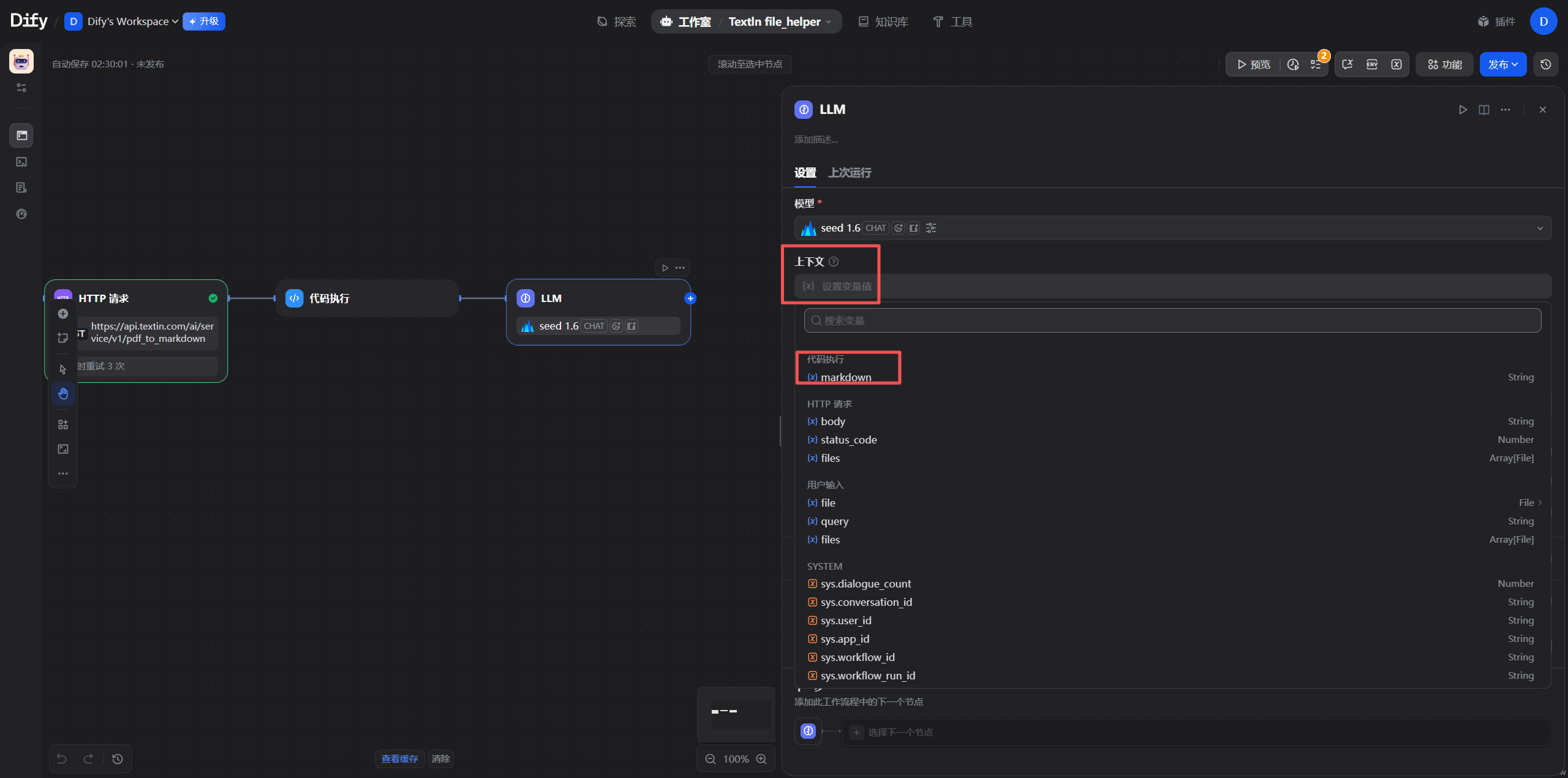 在上下文设置区域,点击变量添加按钮,选中代码执行节点输出的 markdown 变量。这一步至关重要,它建立了数据流的传递通路,确保大模型看到的不是空洞的指令,而是实实在在的文档内容。