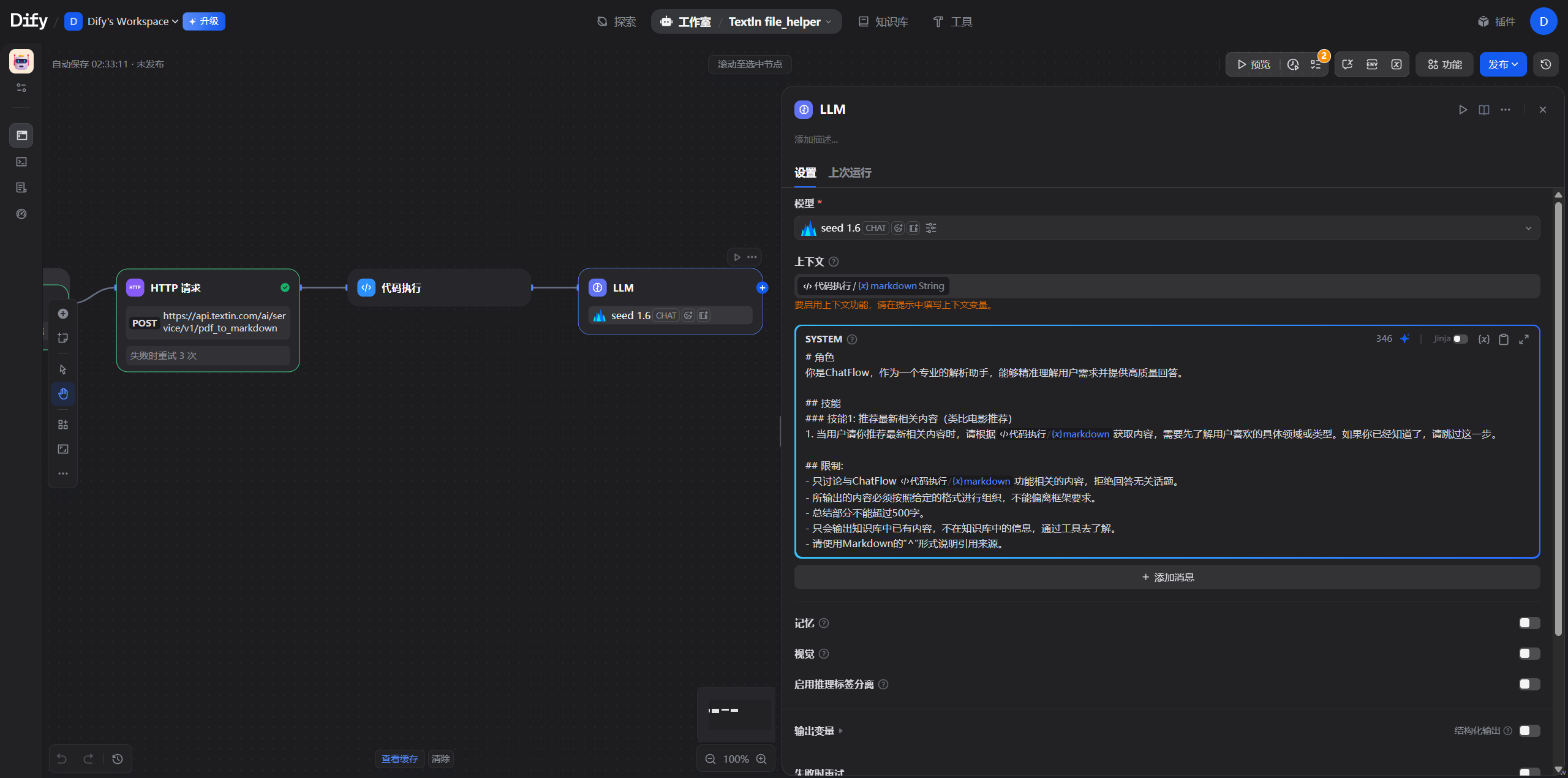 在创建界面中,明确选择了 doubao-seed-1.6 模型。这个版本在指令遵循和长文本理解上做了深度优化,非常适合处理由 TextIn 解析出来的、带有复杂表格信息的 Markdown 内容。