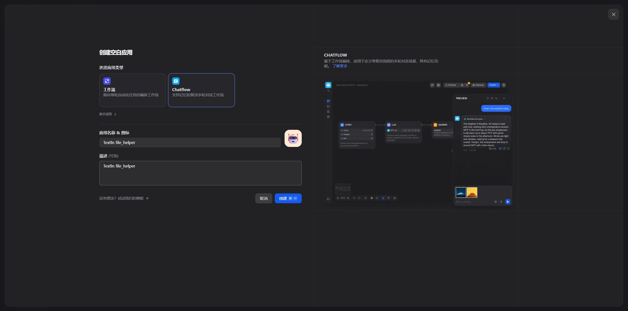 在创建应用的弹出窗口中,开发者需要面对四种不同的模式:聊天助手、工作流、代理以及 ChatFlow。在这里选择了"工作流"模式,这种模式允许开发者像拼积木一样,将不同的技术节点连接起来。在图标选择上,可以使用系统提供的多种色彩方案来标识应用。命名为"TextIn 智能解析"后,点击确认,系统就会进入到核心的画布编辑页面。