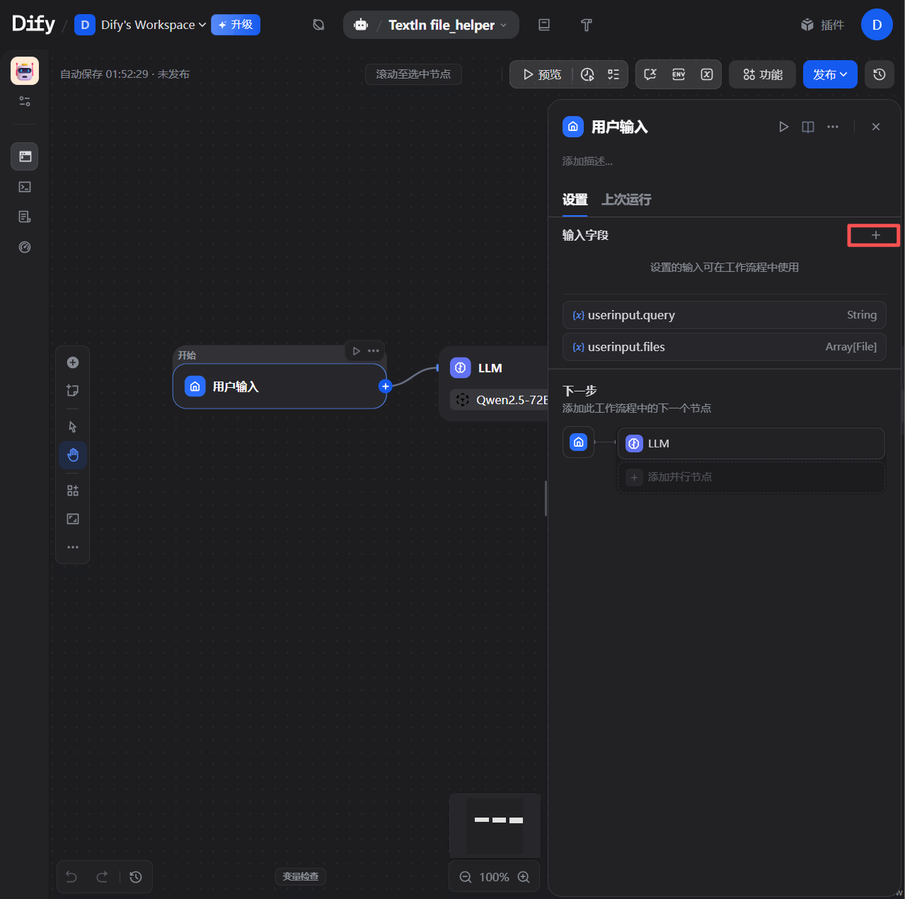 在画布的起始位置,可以看到"开始"节点的配置界面。右侧的面板中,"输入字段"这一栏决定了应用能接收什么样的数据。点击添加按钮,开发者可以根据需求定义变量。在处理报表或 PDF 时,文件类型的支持是不可或缺的。