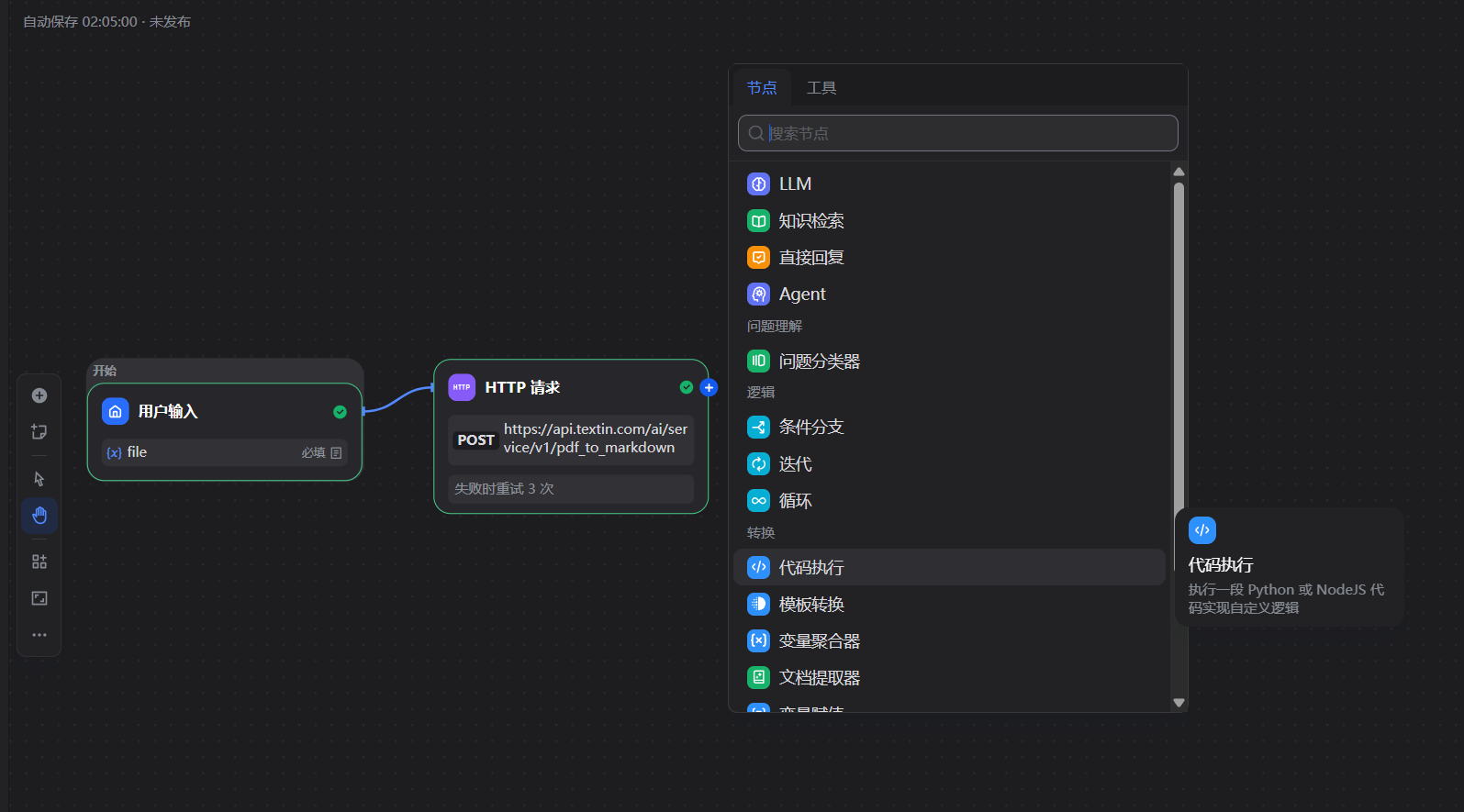在 HTTP 请求节点的末端,添加一个"代码执行"节点。该节点内置了 Python 3 运行时环境,允许开发者编写自定义脚本来处理上游节点输出的任何数据。
