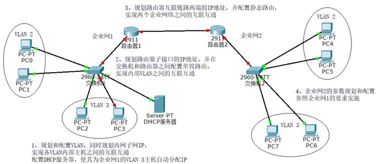 本实验的目的在于搭建一个中小型企业网。根据公司不同部门组成,并分布在不同地点,因此需要划分不同网络实现互联互通。设计以下网络:一个企业网内通过单臂路由配置实现各部门主机相连,两个企业网通过路由器设置静态路由实现不同路由器下各部门主机相连,每个企业网下使用一台交换机连接,为了控制网络上的广播风暴,增加网络的安全性,在交换机上需要设置VLAN。在企业网1中的VLAN 3配置DHCP服务器为主机自动分配IP。